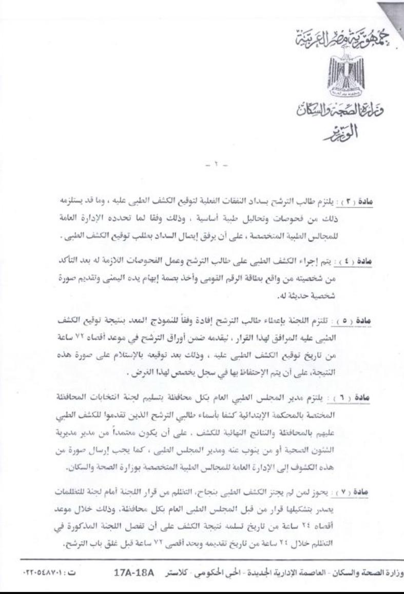 يشترط التأكد من هوية طالب الترشح من خلال بطاقة الرقم القومي وأخذ بصمة الإبهام اليمنى وصورة شخصية حديثة قبل إجراء الفحوصات
