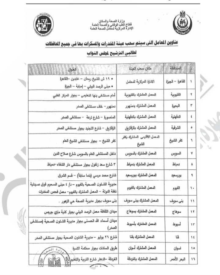 عناوين معامل تحاليل المخدرات والمسكرات لطالبي الترشح لانتخابات مجلس النواب 2025
