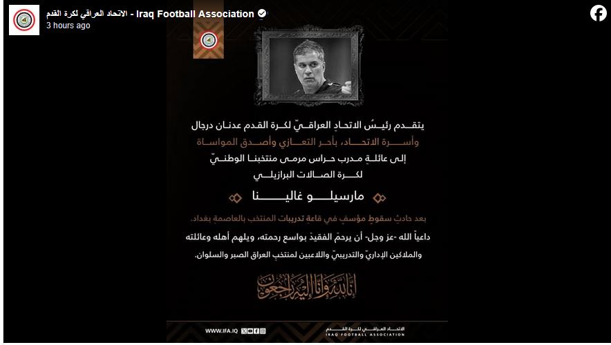 لقي البرازيلي مارسيلو جالينا، مدرب حراس مرمى منتخب العراق لكرة القدم داخل الصالات، مساء السبت مصرعه إثر حادث مأساوي.