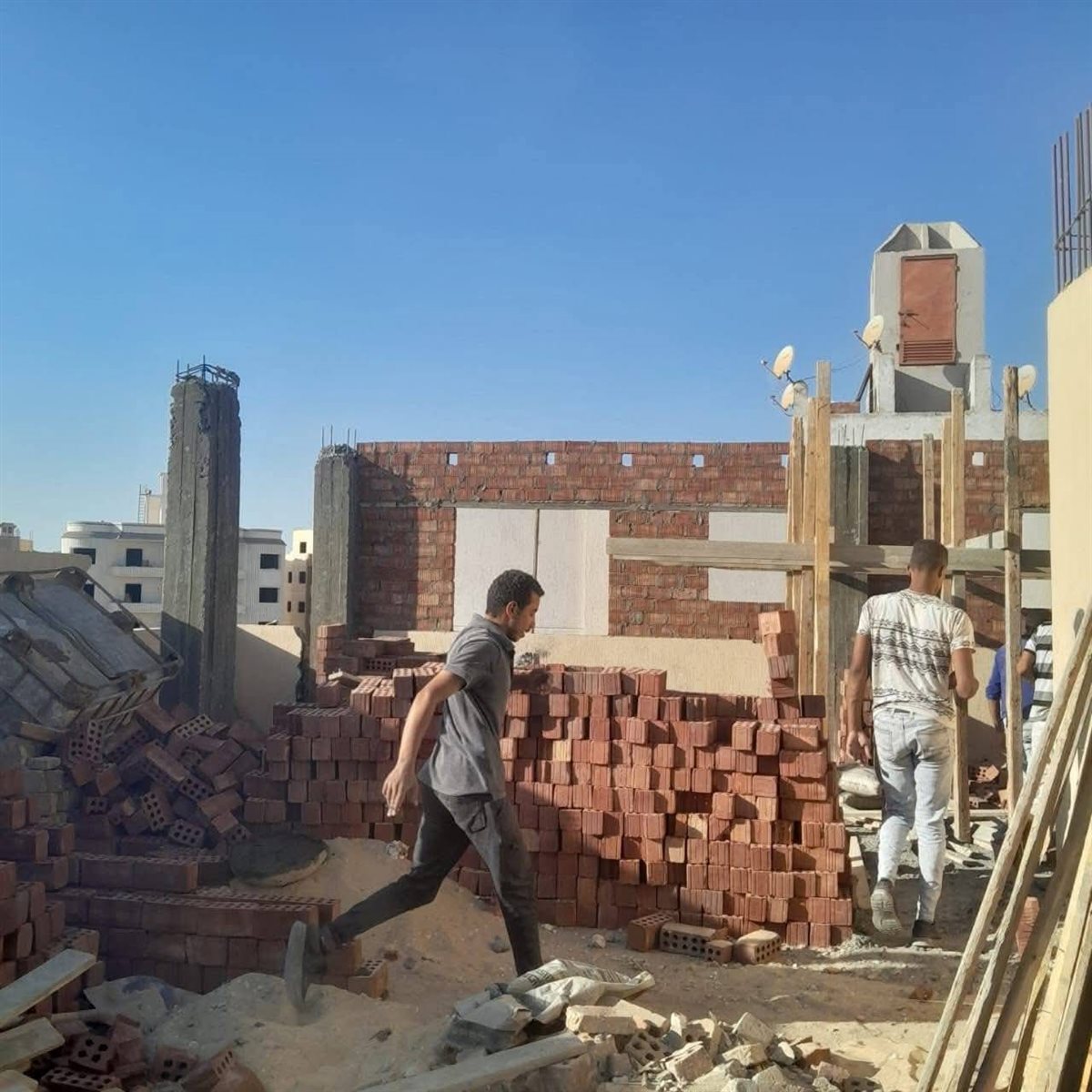 كما تم إزالة المخالفات البنائية بغرف السطح بالحي الثاني – المجاورة الثانية – قطعة 463، وإزالة الأعمدة الخرسانية المخالفة وفك الشدّات الخشبية، بالحي الرابع – قطعة 1585، كما تم إزالة تامة للأعمال المخالفة بنسبة 100% من مساحة الروف في منطقة بيت الوطن – القطعة 130A.
