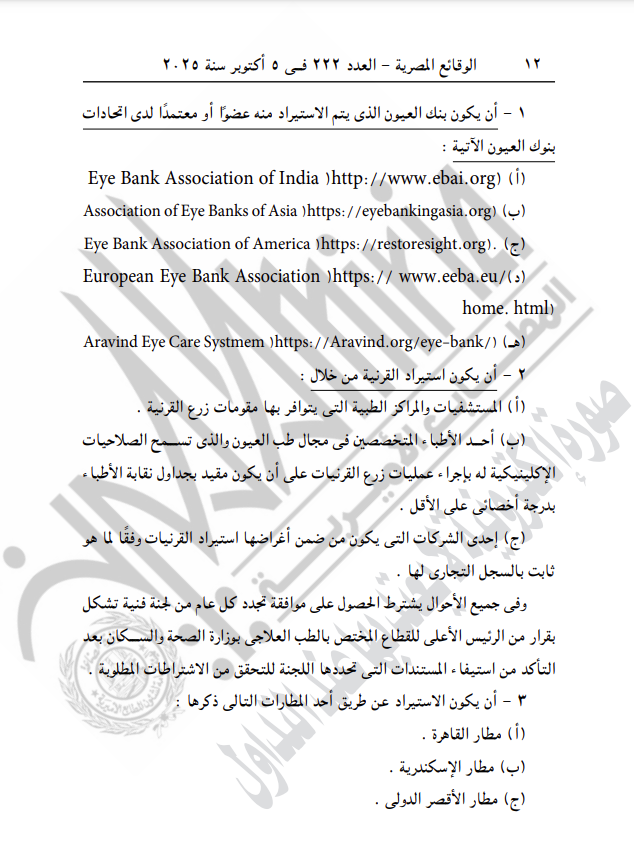 مادة 1 - يشترط للترخيص باستيراد قرنيات العيون، توافر الضوابط والاشتراطات الآتية: