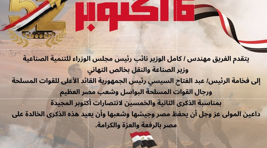 تقدم الفريق كامل الوزير، نائب رئيس مجلس الوزراء للتنمية الصناعية وزير الصناعة والنقل، بخالص التهنئة للرئيس عبد الفتاح السيسي رئيس الجمهورية القائد الأعلى للقوات المسلحة، ورجال القوات المسلحة البواسل وشعب مصر العظيم بمناسبة الذكرى الثانية والخمسين لانتصارات أكتوبر المجيدة، داعيًا المولى عز وجل أن يحفظ مصر وجيشها وشعبها وأن يعيد هذه الذكرى الخالدة على مصر بالرفعة والعزة والكرامة.