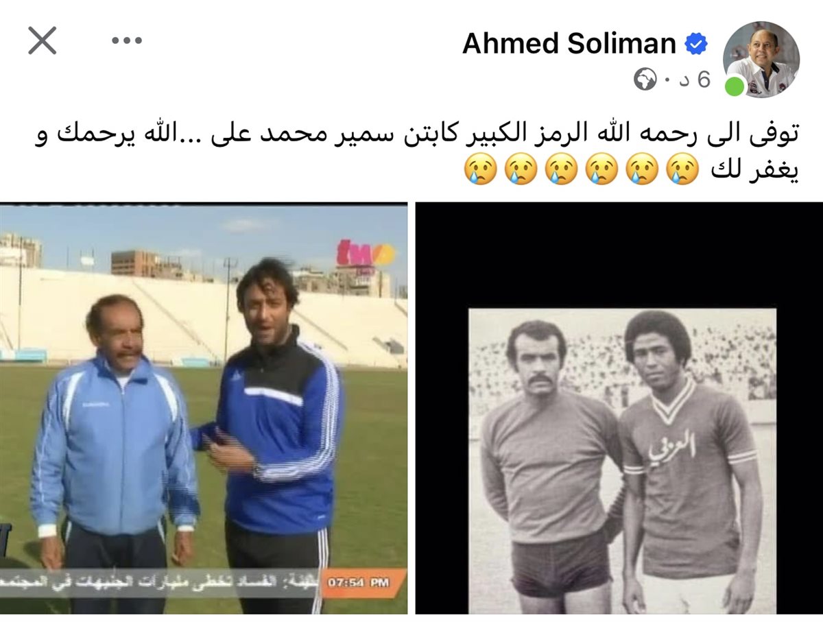 وكتب سليمان: “توفى إلى رحمة الله الرمز الكبير كابتن سمير محمد علي… الله يرحمك ويغفر لك”.