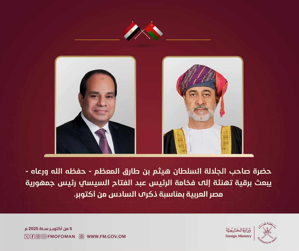 بعث هيثم بن طارق سلطان عمان برقية تهنئة إلى الرئيس عبد الفتاح السيسي، بمناسبة ذكرى السادس من أكتوبر.