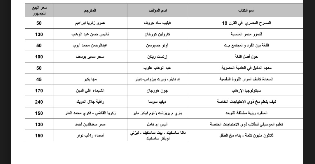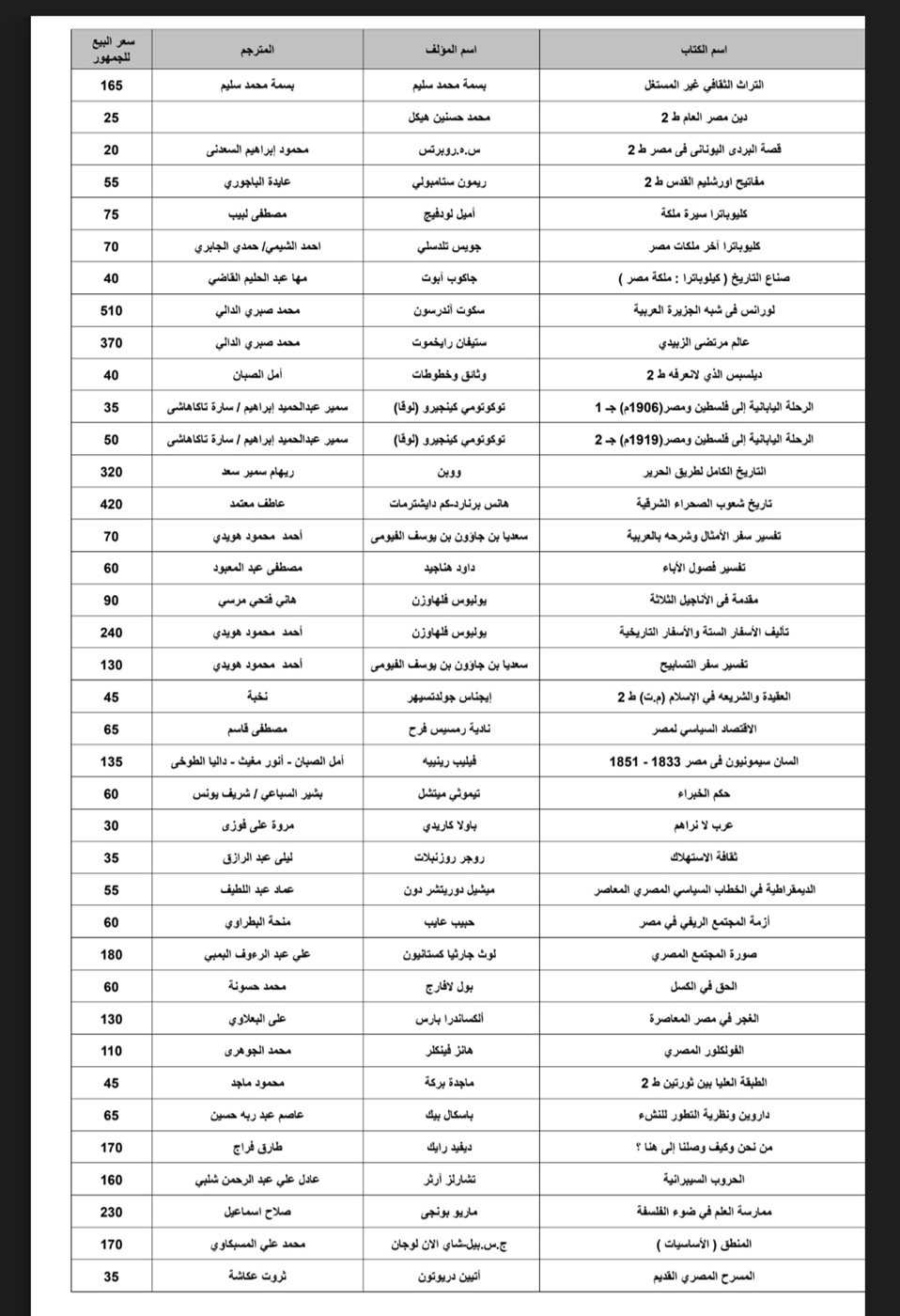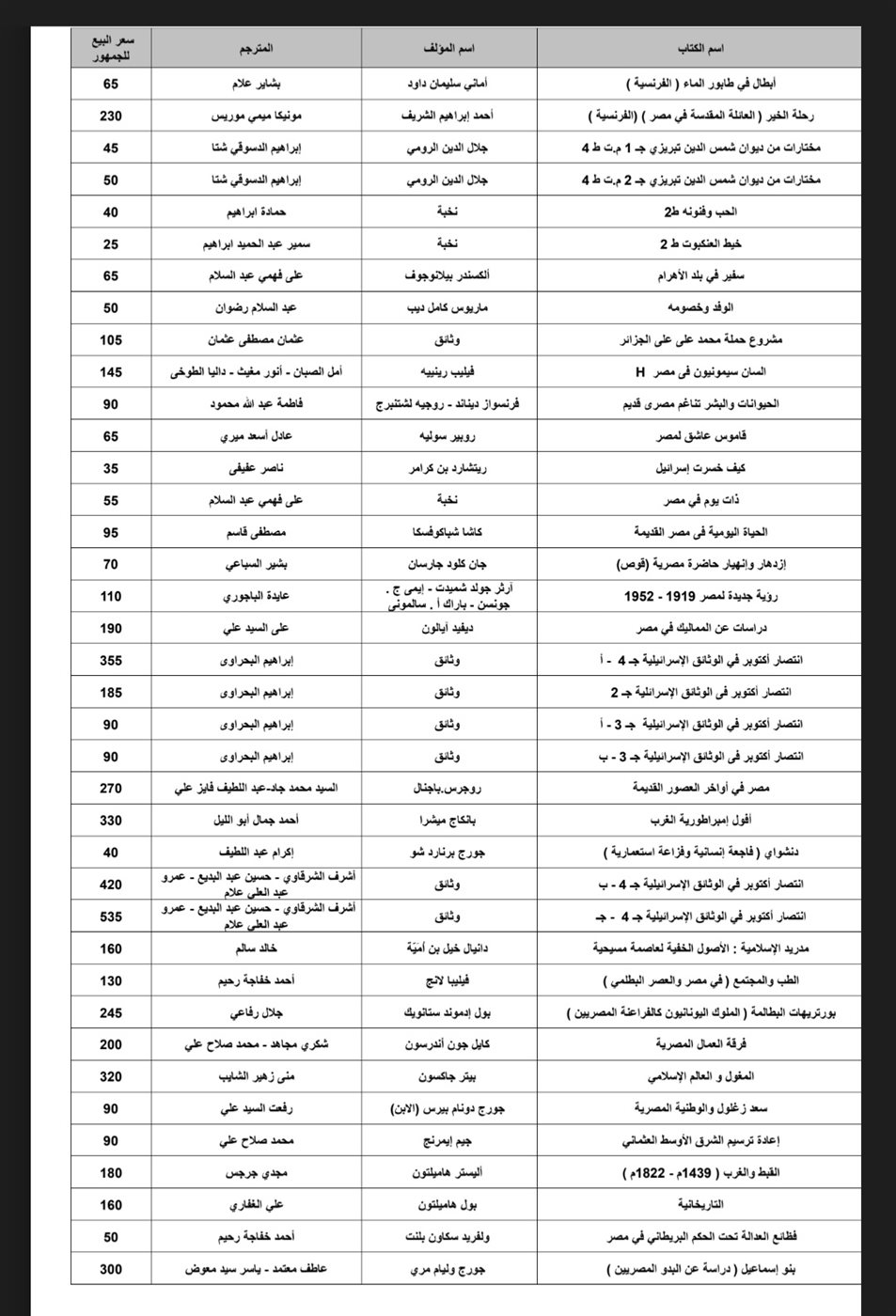 تتضمن قائمة مشاركات المركز القومي للترجمة في المعرض ما يقرب من ١٢٥ عنوان من أهم وأحدث إصداراته التي تختص بالشأن المصري وتاريخه الحافل بالانتصارات.. نستعرض القائمة الكاملة وبالأسعار ومن بينها؛ "الحب والحرب في عيون طفل"، و"مفاجأة أكتوبر"، و"قاموس عاشق لمصر"، و"كيف خسرت إسرائيل"، و"ذات يوم في مصر"، و"انتصار أكتوبر في الوثائق الإسرائيلية"، و"دنشواي.. فاجعة إنسانية وفزاعة استعمارية"، و"فرقة العمال المصرية"، و"سعد زغلول والوطنية المصرية"، و"التاريخانية"، و"فظائع العدالة تحت الحكم البريطاني في مصر"، و"بنو إسماعيل.. دراسة عن البدو المصريين"، و"صورة المجتمع المصري"، و"كليوباترا.. سيرة ملكة"، و"التراث الثقافي غير المستغل".