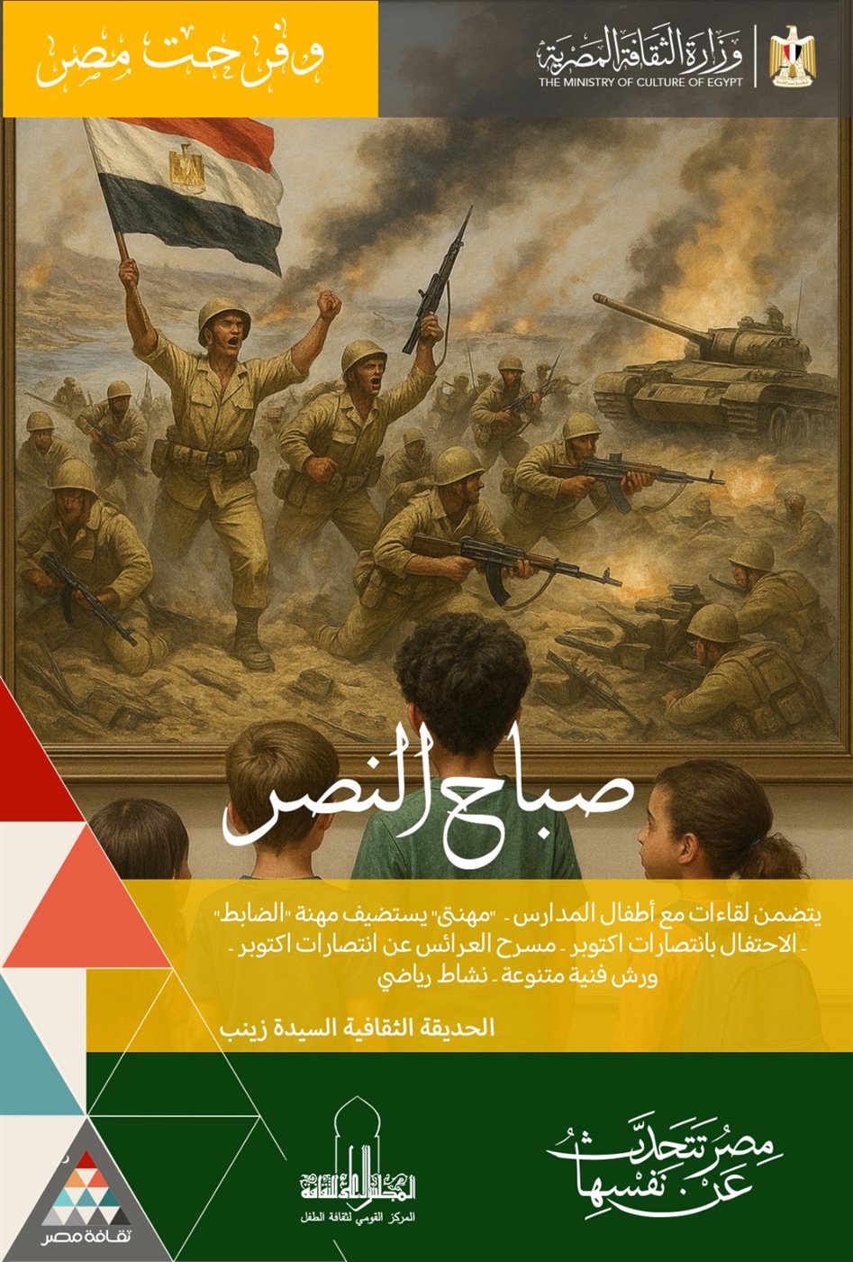 يقيم المركز القومي لثقافة الطفل التابع للمجلس احتفالات ذكرى نصر أكتوبر بالحديقة الثقافية للأطفال، ضمن مبادرة وزارة الثقافة "وفرحت مصر"، اليوم الإثنين ٦ أكتوبر ٢٠٢٥ الساعة السادسة مساء.