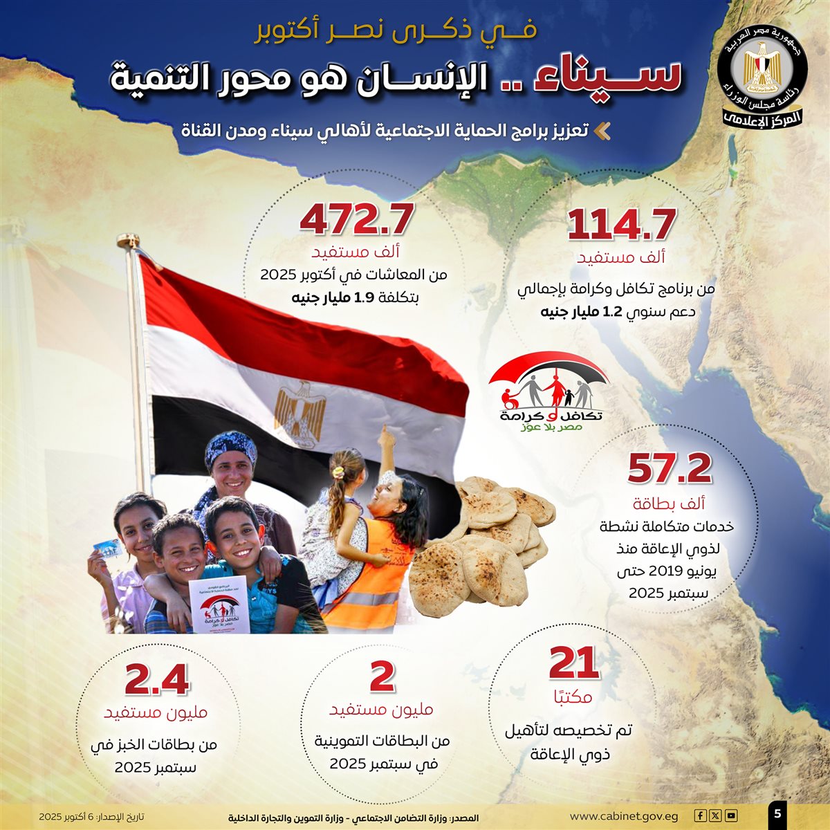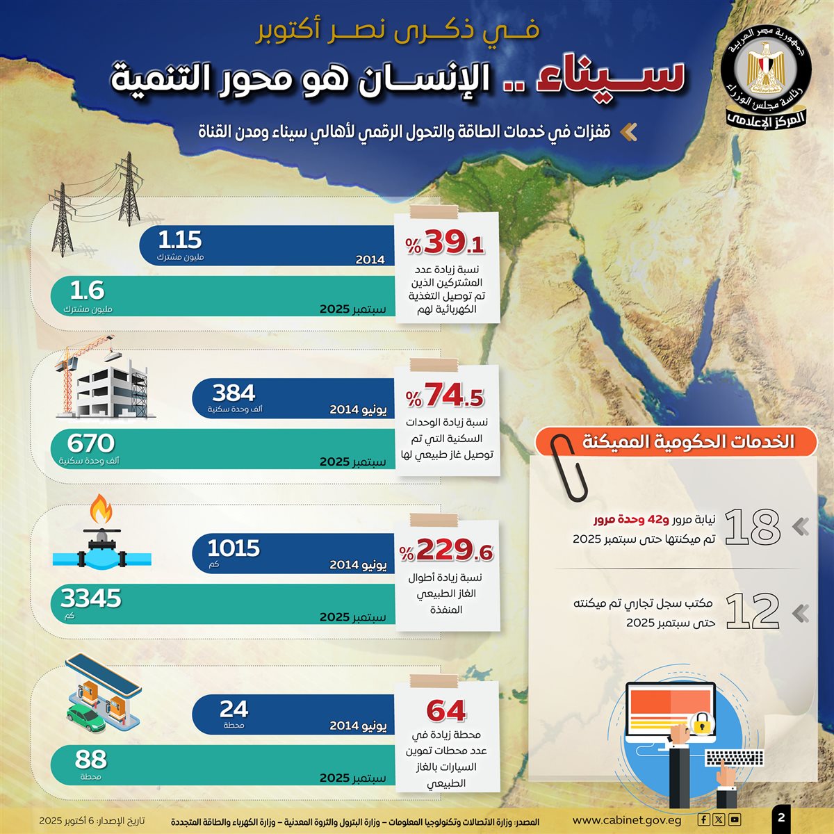 نشر المركز الإعلامي لمجلس الوزراء، عددًا من الإنفوجرافات على منصاته بمواقع التواصل الاجتماعي، تحت عنوان "سيناء.. الإنسان هو محور التنمية"، لتسليط الضوء على الطفرة التنموية والإنجازات في مختلف القطاعات في سيناء، بما ينعكس على تحسين حياة أبنائها، وذلك في ذكرى نصر أكتوبر.