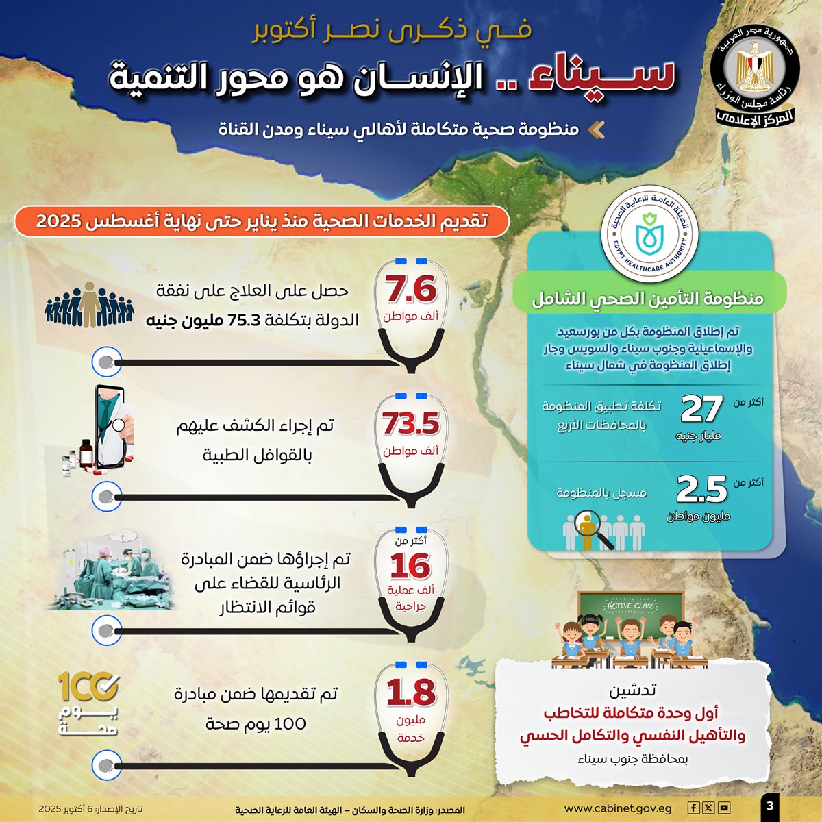 وتطرقت الإنفوجرافات إلى المنظومة الصحية المتكاملة لأهالي سيناء ومدن القناة، فعلى صعيد منظومة التأمين الصحي الشامل، تم إطلاق المنظومة بكل من بورسعيد، والإسماعيلية، وجنوب سيناء، والسويس، بتكلفة تجاوزت 27 مليار جنيه، حيث بلغ عدد المسجلين بالمنظومة أكثر من 2.5 مليون مواطن، وجاري إطلاق المنظومة في شمال سيناء.
