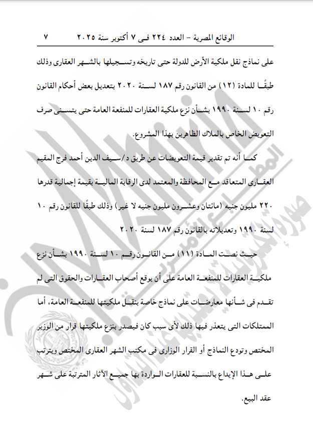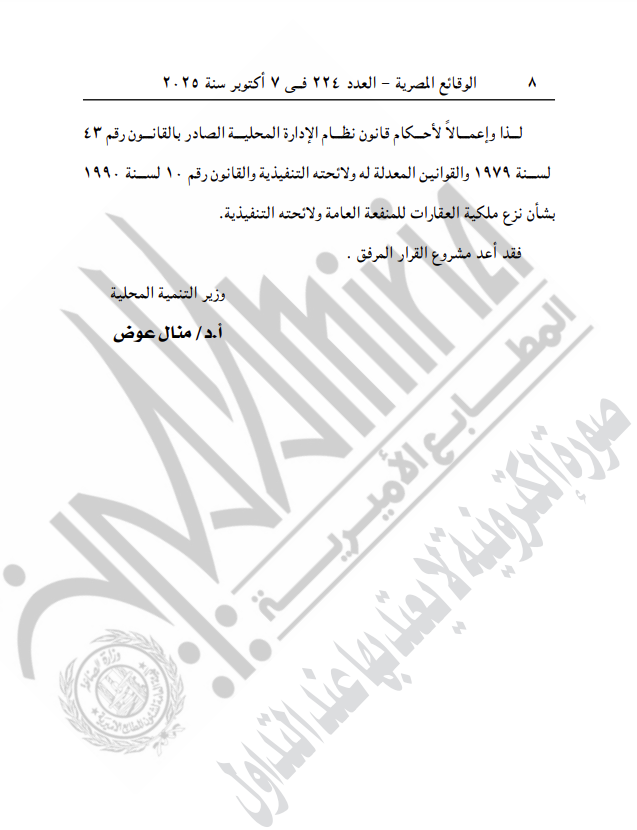 ونصت المادة الأولى لقرار وزارة التنمية المحلية على "نزع ملكية العقارات والأراضي، الصادر بشأنها قرار رئيس مجلس الوزراء رقم 76 لسنة 2025".