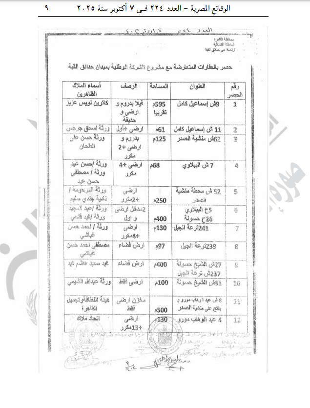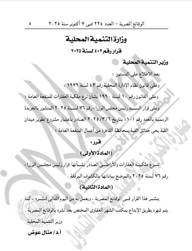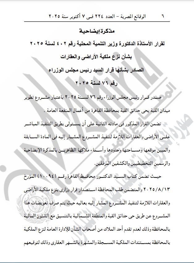نشرت جريدة الوقائع المصرية في عددها رقم 224، الصادر في 7 أكتوبر 2025، قرار وزارة التنمية المحلية رقم 402 لسنة 2025، بشأن نزع ملكية أراضي وعقارات مشروع تطوير ميدان القبة، بحي حدائق القبة بمحافظة القاهرة.