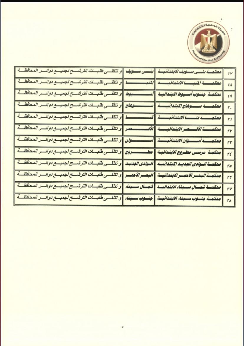 وتتولى لجان متابعة سير العملية الانتخابية بالمحاكم الابتدائية الواردة بالكشوف المرفقة، تلقّي طلبات الترشح بالنظام الفردي على النحو التالي: