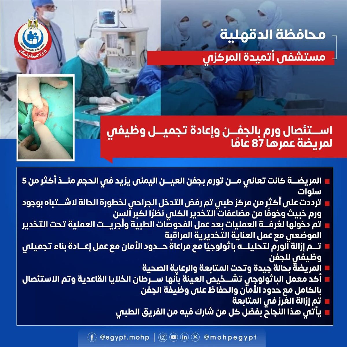 أعلنت وزارة الصحة عن نجاح فريق طبي بمستشفى أتميدة المركزي بمحافظة الدقهلية في إجراء عملية دقيقة لاستئصال ورم بجفن العين الأيمن لمريضة تبلغ من العمر 87 عامًا، مع إعادة بناء الجفن تجميليا ووظيفيا.