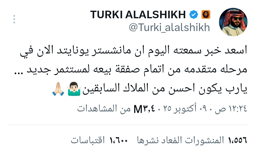 وكتب آل الشيخ: "أسعد خبر سمعته اليوم أن مانشستر يونايتد في مرحلة متقدمة من إتمام صفقة بيعه لمستثمر جديد.. يارب يكون أفضل من الملاك السابقين".