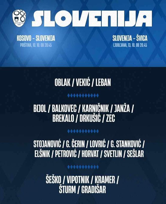 أعلن الجهاز الفني لمنتخب سلوفينيا الأول لكرة القدم عن تشكيل الفريق لمواجهة منتخب كوسوفو اليوم الجمعة، في إطار تصفيات كأس العالم 2026 عن قارة أوروبا.