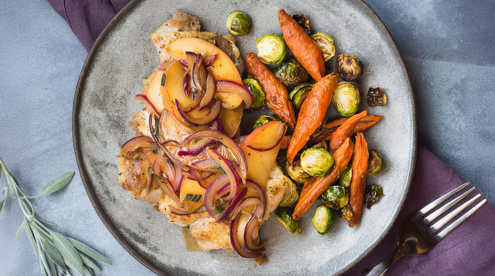 يعد التفاح إضافة رائعة للأطباق الرئيسية، خاصة عند مزجه مع الخضروات الجذرية. في هذه الوصفة، يطهى التفاح مع البصل والميرمية ومرق الدجاج والخردل. يقدم هذا المزيج الشهي بجانب أفخاذ الدجاج وكرنب بروكسل المشوي والجزر المشوي.