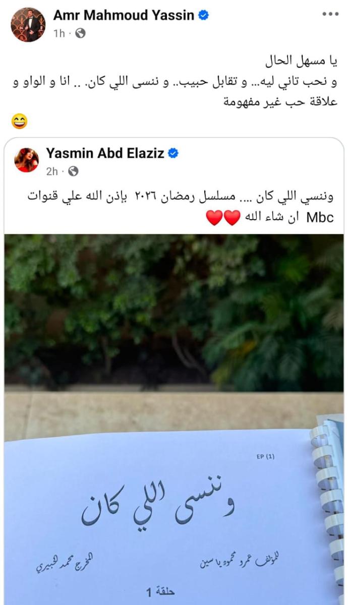 وتأكيدًا لمنشور ياسمين كشف الفنان كريم فهمي حقيقة مشاركته في العمل وقال في مقع فيديو لـ"ET بالعربي": "أشارك في رمضان 2026 مع ياسمين عبد العزيز بشكل نهائي، فهي صديقتي وأحب العمل معاها بصورة كبيرة، وأتمنى التعاون معاها لسنوات طويلة.. انتظروا مسلسل قوي ومختلف".