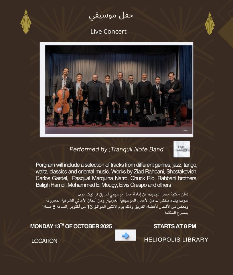 يستضيف مسرح مكتبة مصر الجديدة في تمام الساعة السابعة من مساء يوم غد الإثنين، أمسية فنية مميزة لفرقة "ترانكيل نوت باند" الموسيقية.