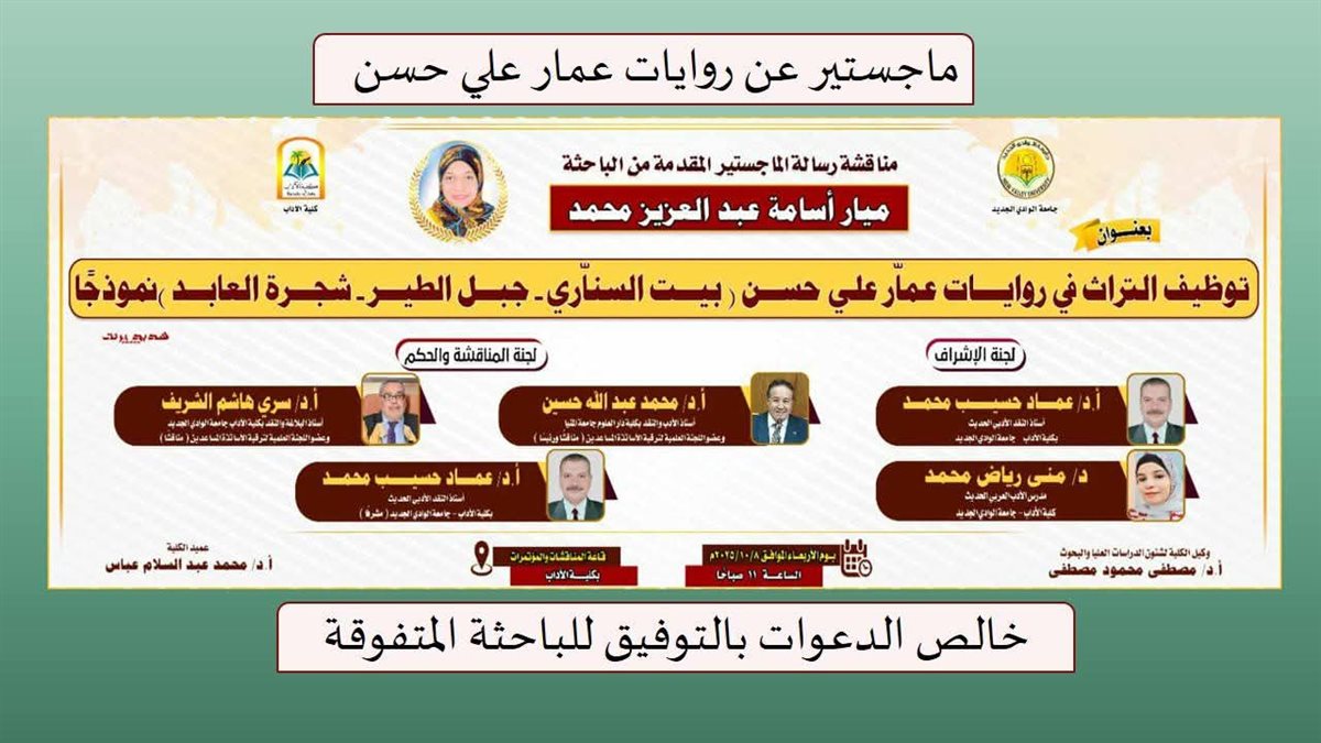 رسالة ماجستير بـ"الوادي الجديد" حول توظيف التراث في روايات عمار علي حسن