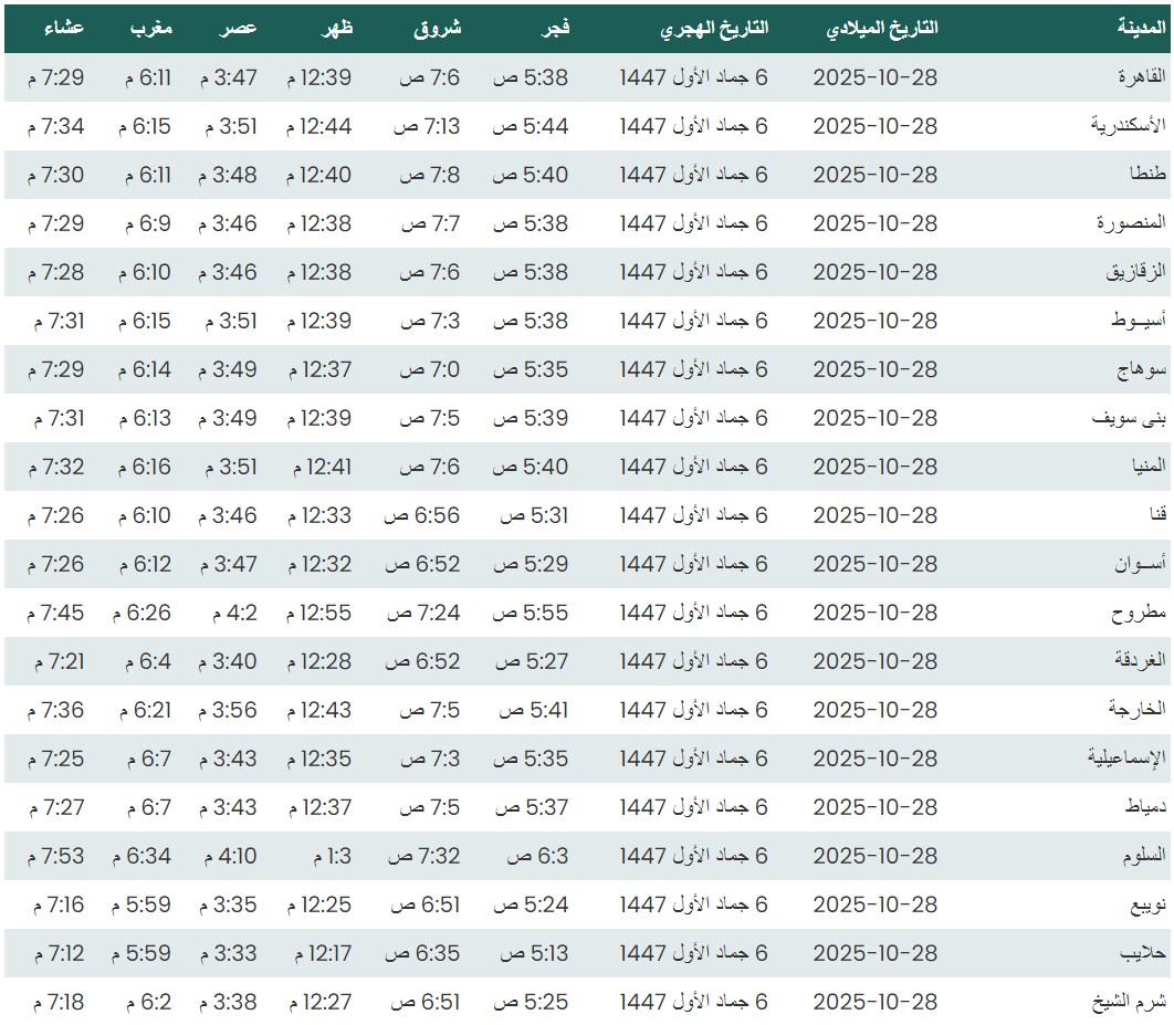 مواقيت الصلاة اليوم الثلاثاء 28 - 10 - 2025 في القاهرة والمحافظات