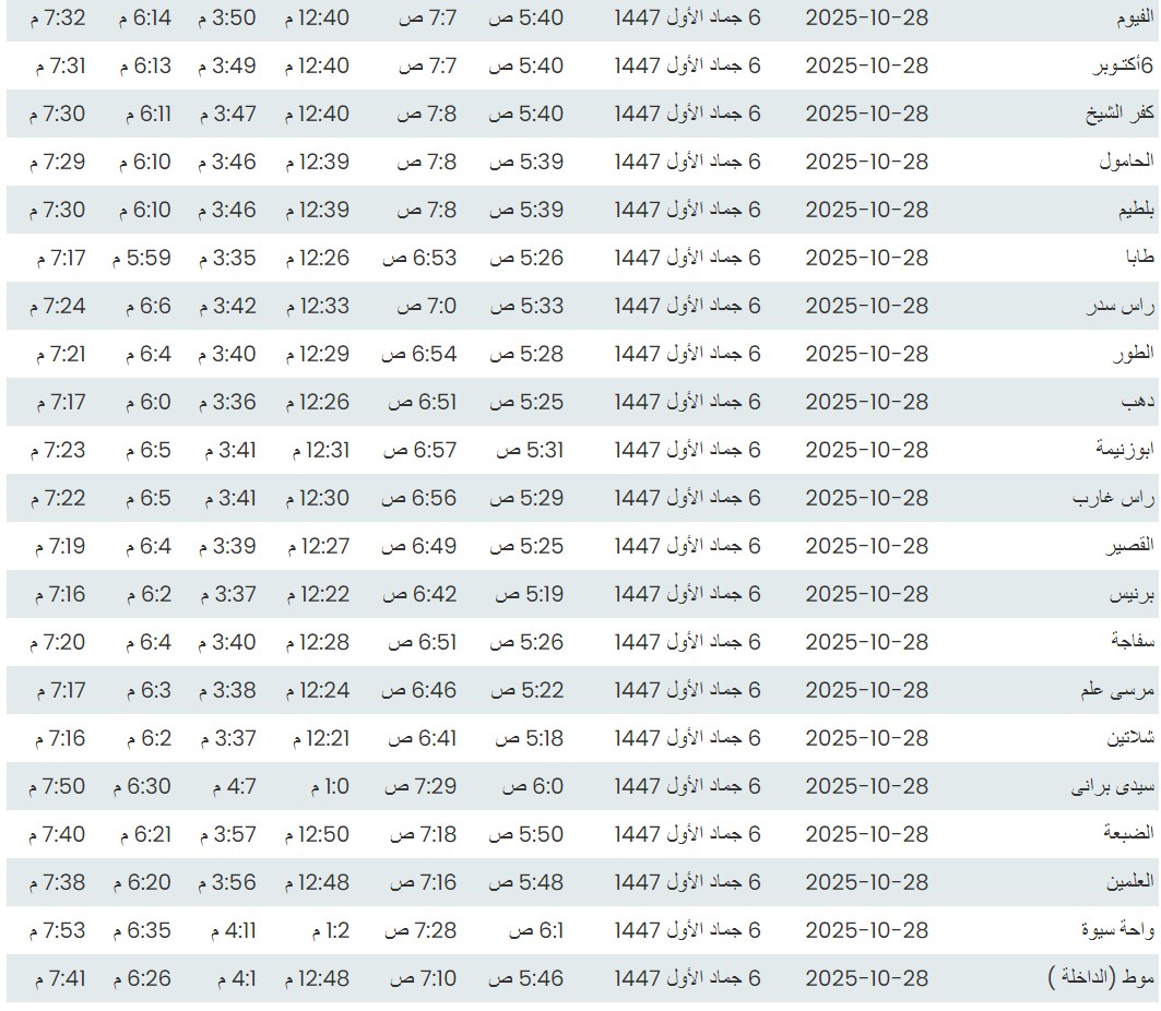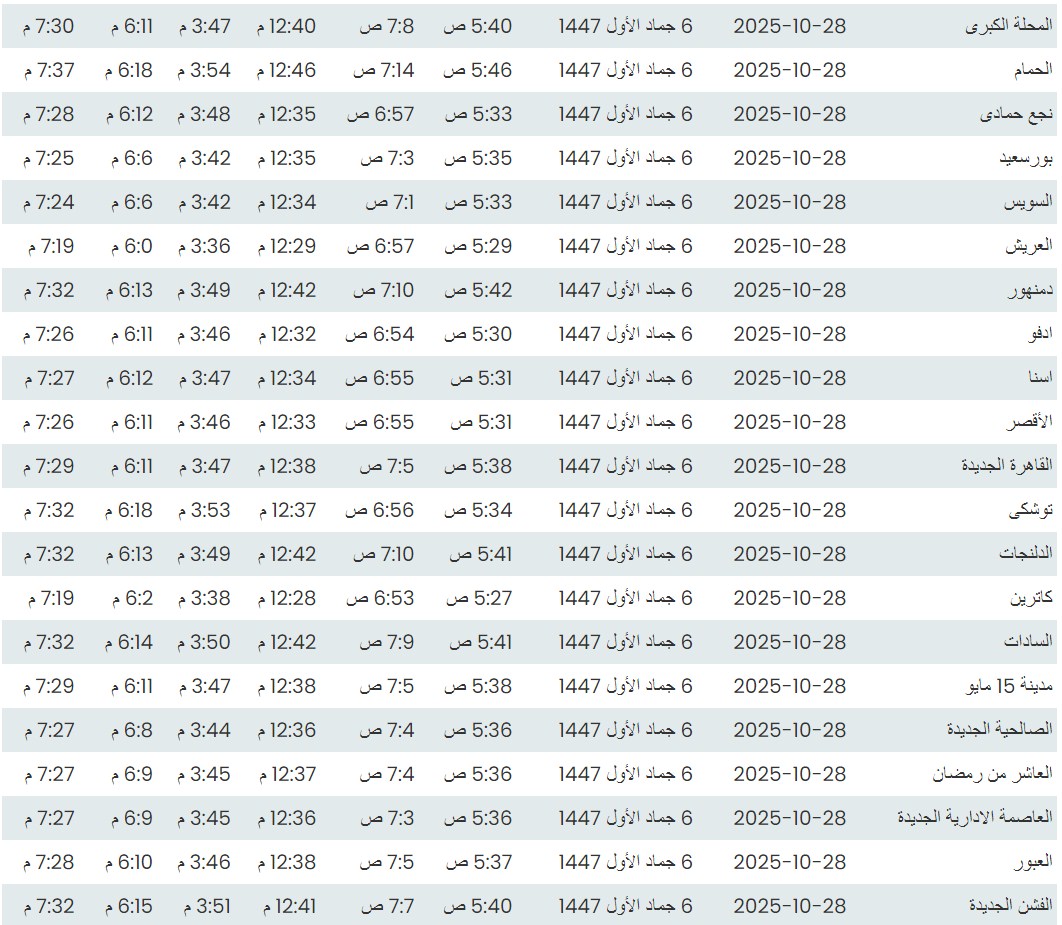 مواقيت الصلاة اليوم وفقًا للتوقيت المحلي لمدينتي القاهرة والإسكندرية وكذلك لعدد من مدن ومحافظات الجمهورية من واقع بيانات الهيئة العامة للمساحة: