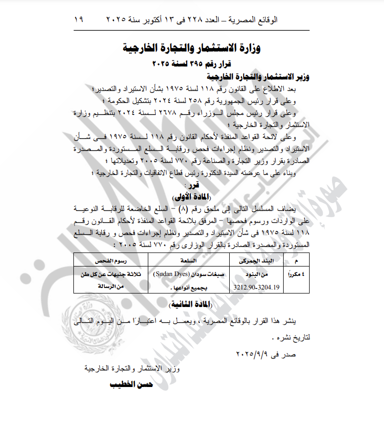 -وقرار وزارة الاستثمار رقم 395 لسنة 2025، بشأن إضافة صبغات سودان بجميع أنواعها إلى ملحق رقم (8) السلع الخاضعة للرقابـة النوعية على الواردات ورسوم فحصها، 3 جنيهات عن كل طن من الرسالة، في لائحة القواعد المنفذة لأحكام القـانون رقم 118 لسنة 1975 فى شأن الاستيراد والتصدير ونظام إجراءات فحص ورقابة الـسلع المستوردة والمصدرة الصادرة بالقرار الوزارى رقم 770 لسنة 2005.