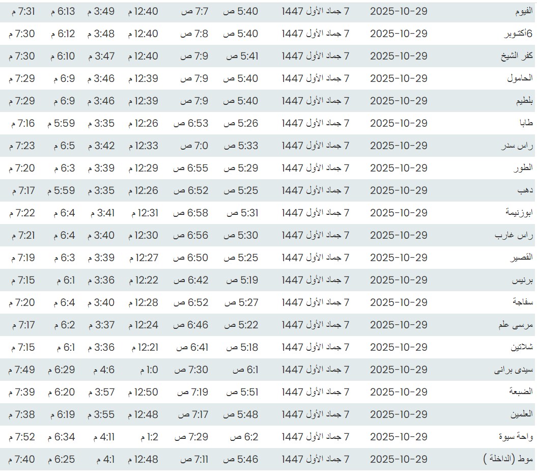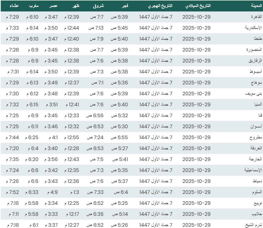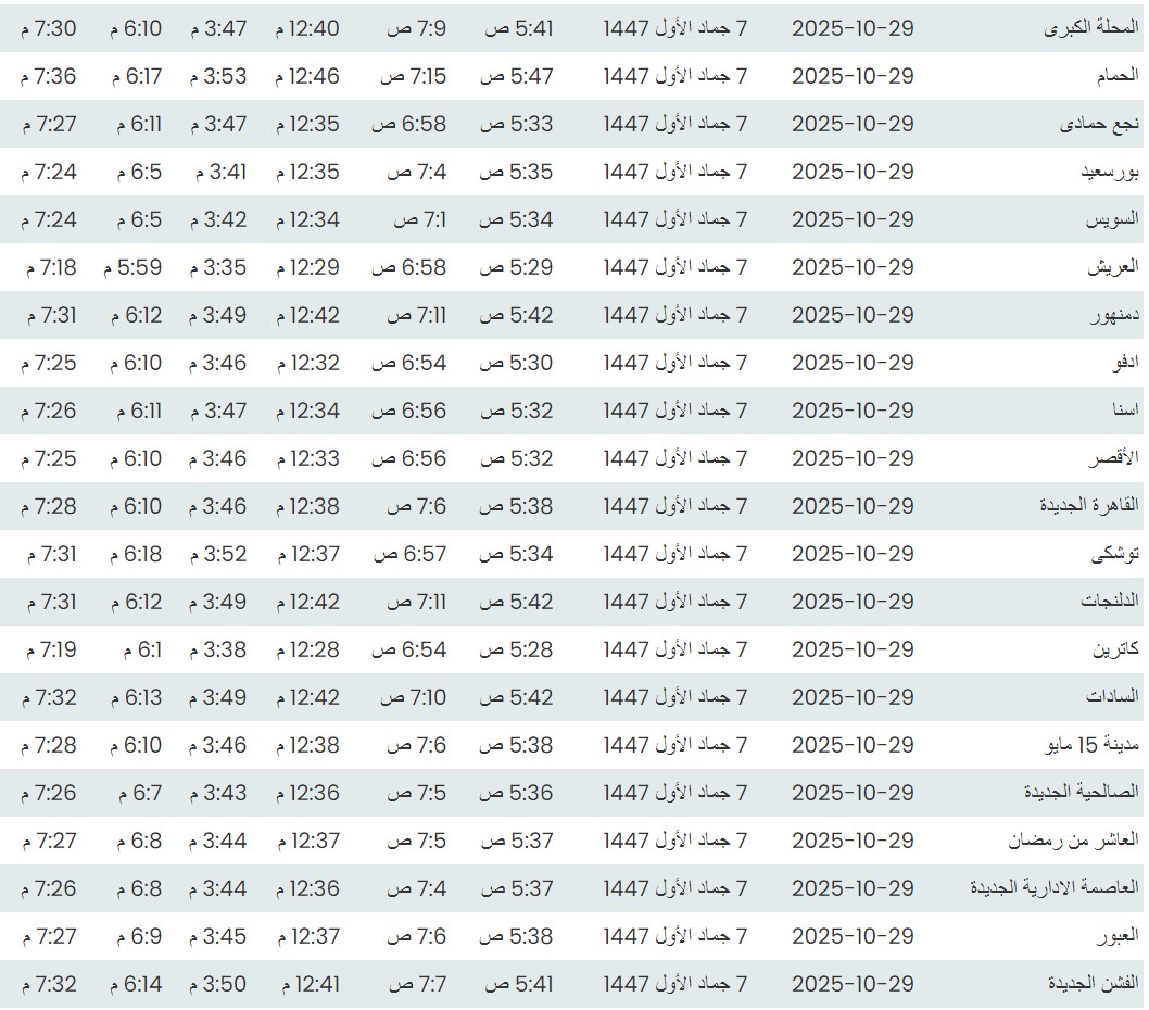 وفيما يلي مواقيت الصلاة، لعدد من مدن ومحافظات الجمهورية من واقع بيانات الهيئة العامة للمساحة