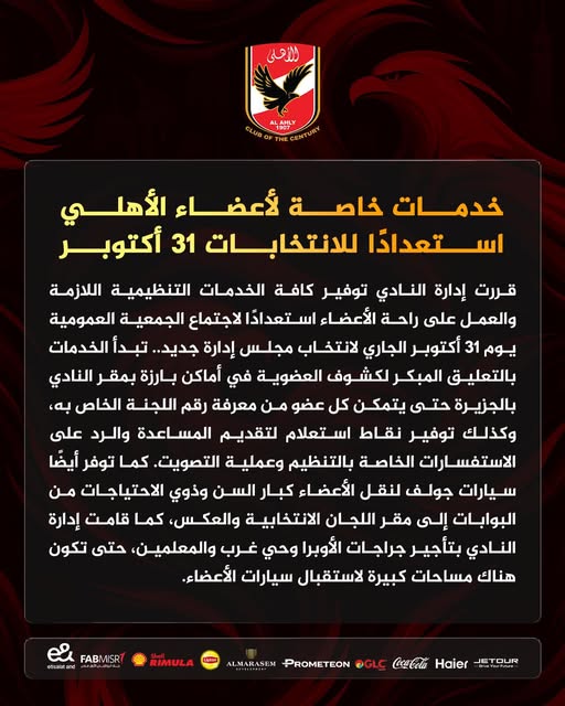 قررت إدارة النادي الأهلي توفير الخدمات التنظيمية اللازمة لراحة الأعضاء، استعدادًا لاجتماع الجمعية العمومية يوم 31 أكتوبر الجاري لانتخاب مجلس إدارة جديد.