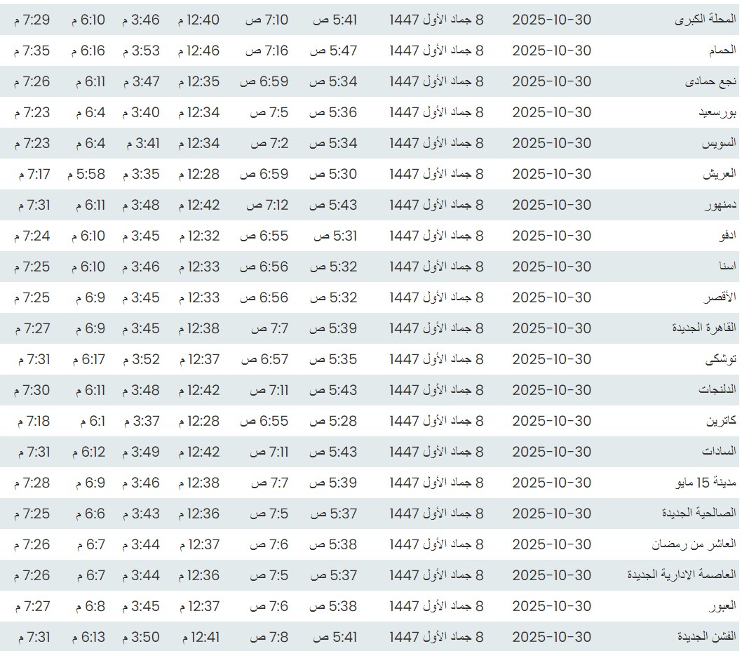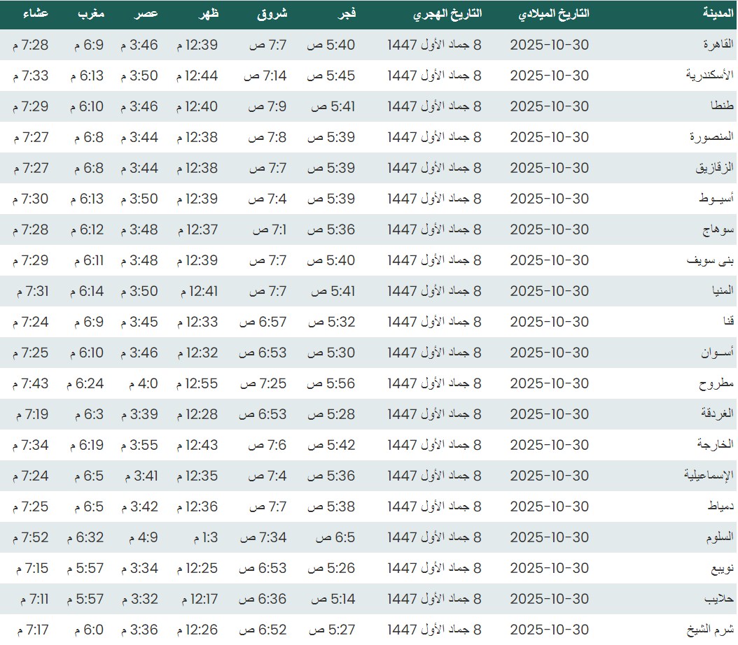 مواقيت الصلاة اليوم الخميس 30 - 10 - 2025 في القاهرة والمحافظات