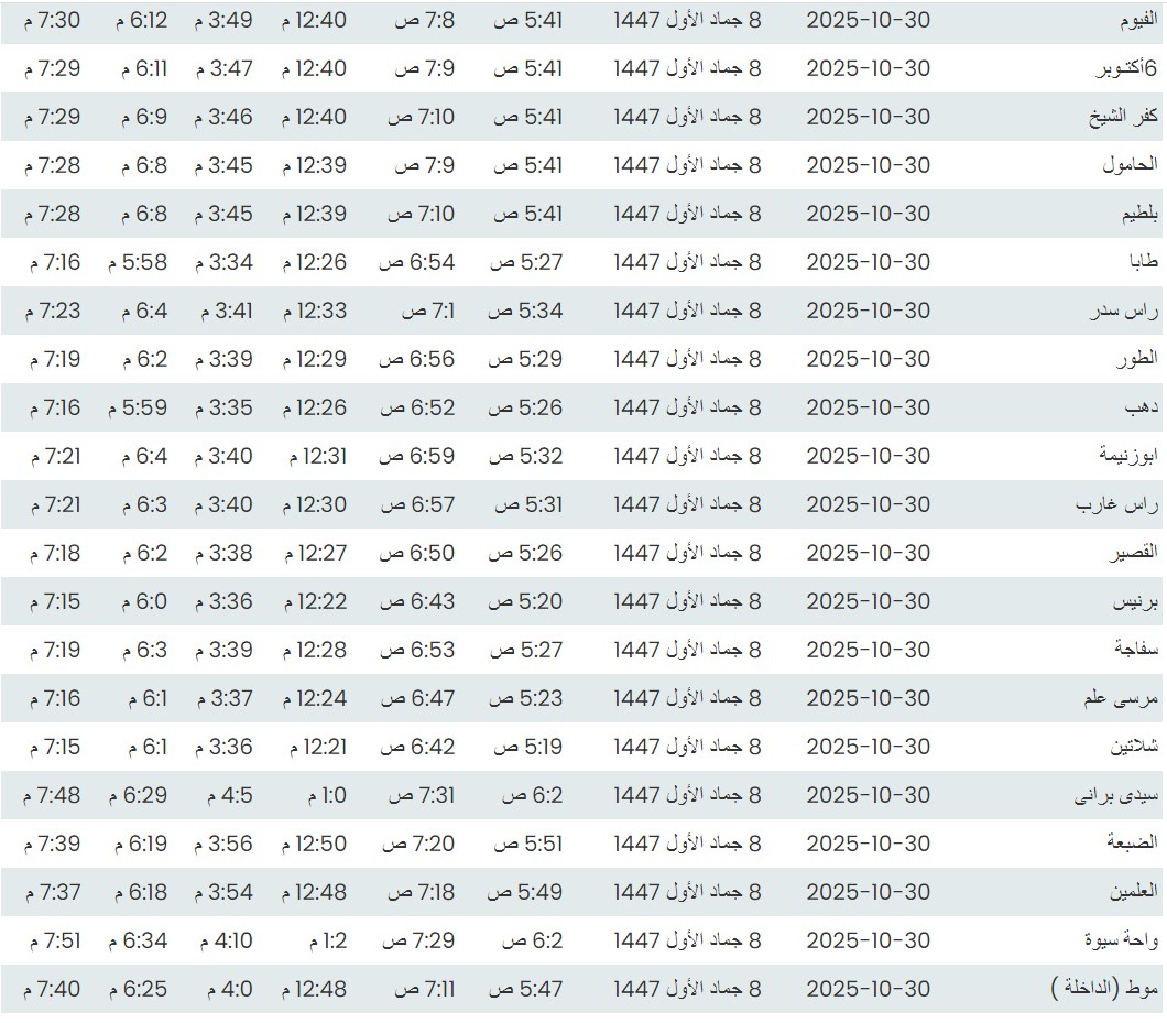 مواقيت الصلاة اليوم وفقًا للتوقيت المحلي لمدينتي القاهرة والإسكندرية وكذلك لعدد من مدن ومحافظات الجمهورية من واقع بيانات الهيئة العامة للمساحة: