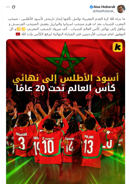 وقال علاء مبارك، عبر منصة "أكس"، في رسالته التي وجهها لـ منتخب المغرب: "ما شاء الله كرة القدم المغربية تواصل تألقها إنجاز تاريخي لأسود الأطلس، منتخب المغرب للشباب بعد أن هزم منتخب إسبانيا والبرازيل يقصي المنتخب الفرنسى ويتأهل إلى نهائي كأس العالم للشباب، ألف مبروك للشعب المغربي".