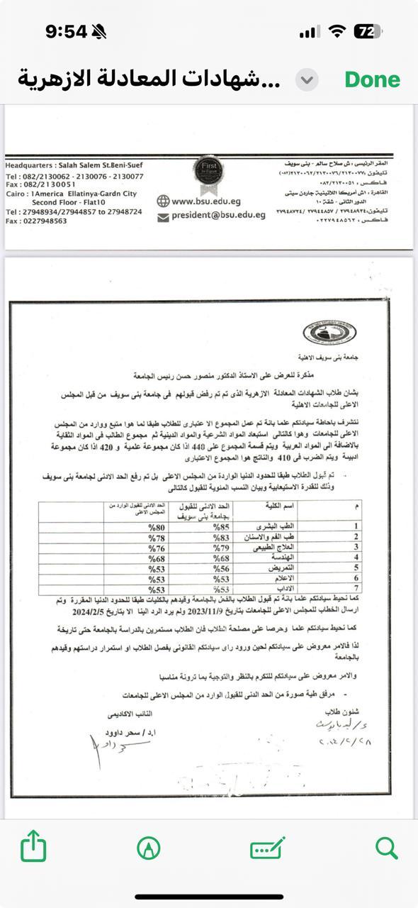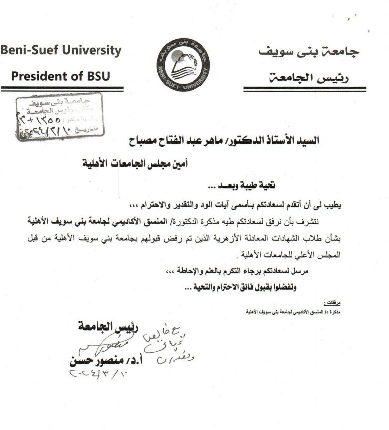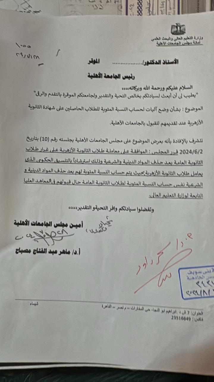 بعدها تسلم د. ماهر مصباح مسئولية أمانة مجلس الجامعات الأهلية بعد استقلاله عن مجلس الجامعات الخاصة والأهلية فأرسل له د. منصور حسن المشرف على جامعة بنى سويف الأهلية فى ذلك الوقت خطابا فى 10 مارس 2024 بشأن موضوع هؤلاء الطلاب وأنه قد تم قبولهم طبقا لما هو متبع بالمجلس الأعلى للجامعات بشأن طلاب الثانوية الأزهرية بعد استبعاد درجات المواد الدينية والشرعية وأنه قد تم قبولهم طبقا للحدود الدنيا الواردة من المجلس الأعلى للجامعات، وبالفعل تم مناقش قضية هؤلاء الطلاب وغيرهم من طلاب الثانوية الأزهرية فى مجلس الجامعات الأهلية فى شهر يونية 2024 بجلسته رقم 10 بتاريخ 2 يونية 2024 وتم إرسال قرار المجلس لجامعة بنى سويف الأهلية وبقية الجامعات الأهلية فى شهر أغسطس 2024 والذى ينص على معاملتهم على غرار مجموع طلاب الثانوية العامة بعد خصم درجات المواد الدينية وقال القرار " أنه بعرض الموضوع على مجلس الجامعات الأهلية بجلسته رقم 10 بتاريخ 2 يونية 2024 قرر الموافقة على معاملة طلاب الثانوية الأزهرية على غرار طلاب الثانوية العامة بعد حذف المواد الدينية والشرعية استرشادا بالتنسيق الحكومى الذى يعامل طلاب الثانوية الأزهرية بحيث يتم حساب النسبة المئوية لهم بعد حذف المواد الدينية والشرعية نفس حساب النسبة المئوية لطلاب الثانوية العامة حال قبولهم فى المعاهد العليا التابعة لوزارة التعليم العالى