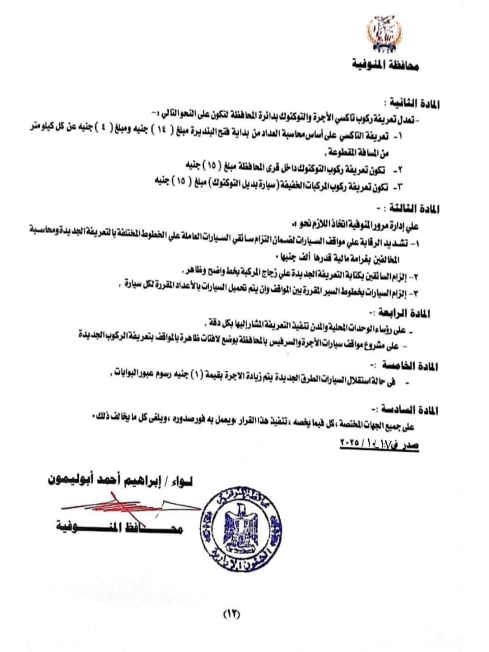 أصدر اللواء إبراهيم أبو ليمون محافظ المنوفية اليوم الجمعة، قرارًا بتعديل تعريفة الركوب الجديدة لسيارات الأجرة والسرفيس والتاكسي والتوك توك بدائرة المحافظة، وذلك عقب قرار لجنة التسعير التلقائي للمنتجات البترولية بوزارة البترول والثروة المعدنية بزيادة أسعار البنزين والسولار اعتبارًا من اليوم الجمعة الموافق 17 أكتوبر 2025.