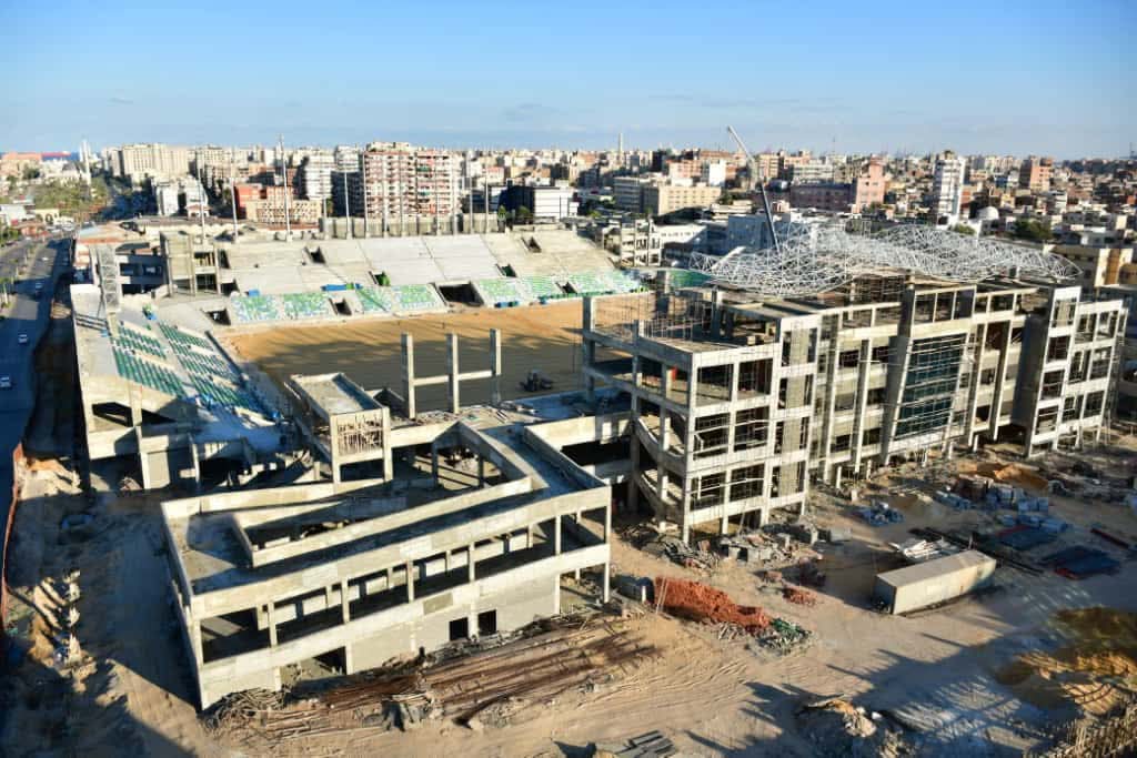 الانتهاء من الأعمال الإنشائية باستاد النادي المصري الجديد وبدء تجهيزات النجيل والإضاءة