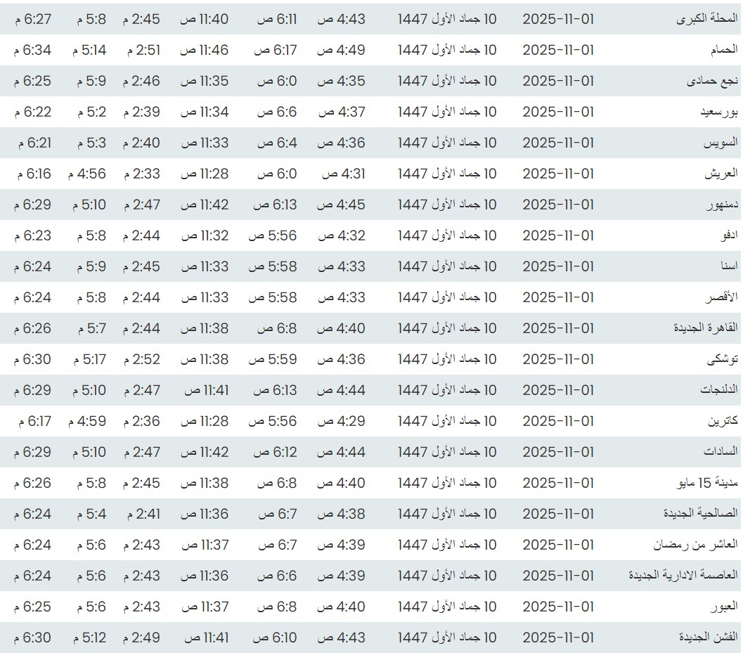 وفيما يلي مواقيت الصلاة، لعدد من مدن ومحافظات الجمهورية من واقع بيانات الهيئة العامة للمساحة