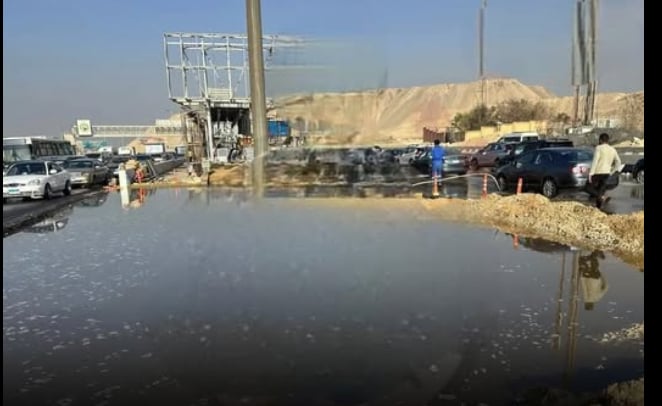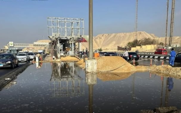 كسر ماسورة مياه يتسبب في كثافات مرورية على طريق الأوتوستراد