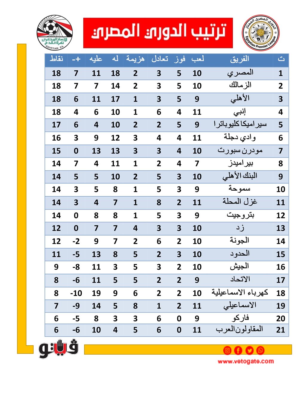 ترتيب الدوري المصري، يتصدر نادي المصري البورسعيدي جدول ترتيب الدوري المصري بفارق الأهداف عن الأهلي والزمالك، قبل مباراتي اليوم الأحد في الجولة الحادية عشر بين زد ضد بتروجيت، وسيراميكا ضد الطلائع.