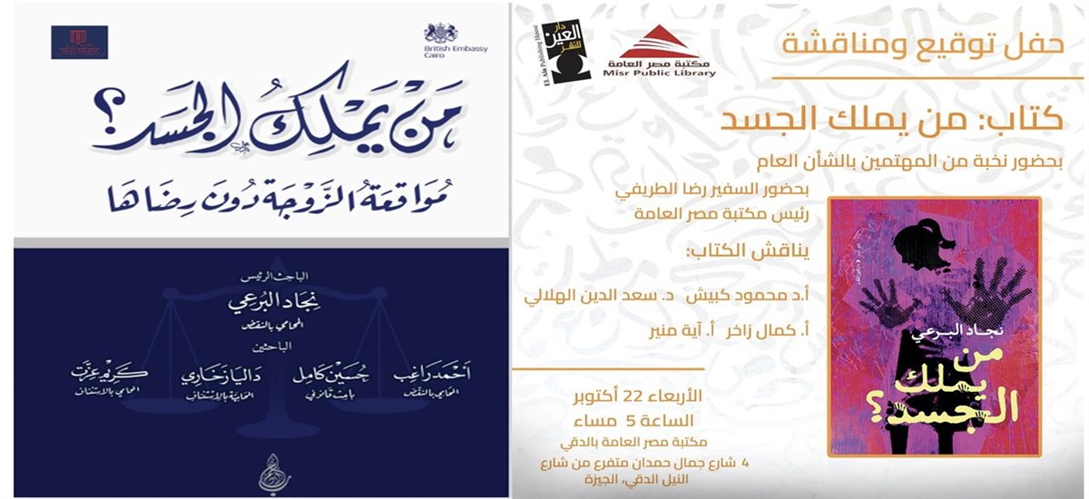 تنظم دار العين للنشر، حفل مناقشة وتوقيع كتاب "من يملك الجسد حول "الاغتصاب الزوجي بين القانون المصري والشريعة الاسلامية " وهو دراسة وضعها المحامي بالنقض نجاد البرعي وساعده فيها المحامي بالنقض أحمد راغب والمحامية بالاستئناف داليا زخاري والمحامي بالاستئناف كريم عزت والباحث القانوني حسين كامل، وذلك فى الساعة الخامسة مساء يوم الأربعاء 22 أكتوبر الجارى بمكتبة مصر العامة بالدقى.