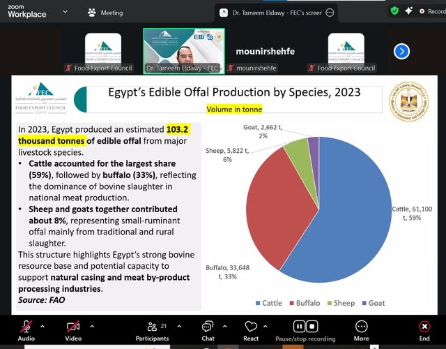 وفي عام 2023، قُدّر إنتاج مصر من المخلفات الحيوانية الصالحة للأكل بنحو 103.2 ألف طن، من الأنواع الحيوانية الرئيسية مثل الأبقار والجاموس والأغنام والماعز، وشكلت الأبقار الحصة الأكبر بنسبة 59%، تليها الجاموس بنسبة 33%، فيما ساهمت الأغنام والماعز بنحو 8% مجتمعتين، وتبرز هذه البنية قاعدة قوية للموارد البقرية في مصر وقدرة محتملة لدعم صناعات الأغلفة الطبيعية ومعالجة المنتجات الثانوية للحوم.