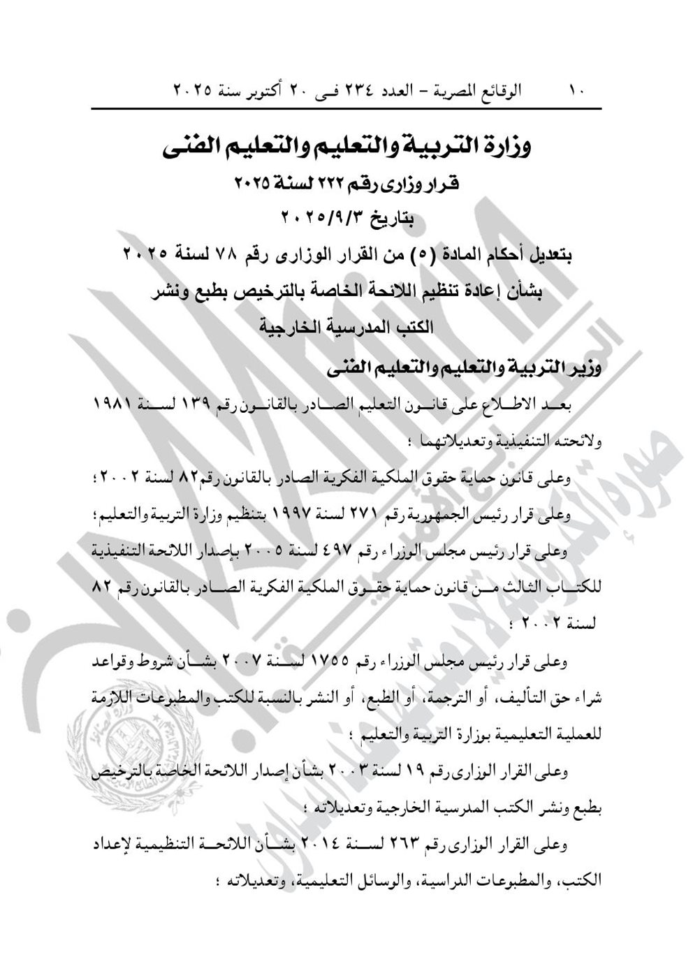 -قرار وزارة التربية والتعليم رقم 222 لسنة 2025، بشأن تعديل أحكام المادة (5) من القرار الوزاري رقم 78 لسنة 2025 بشأن إعادة تنظيم اللائحة الخاصة بالترخيص بطبع ونشر الكتب المدرسية الخارجية.