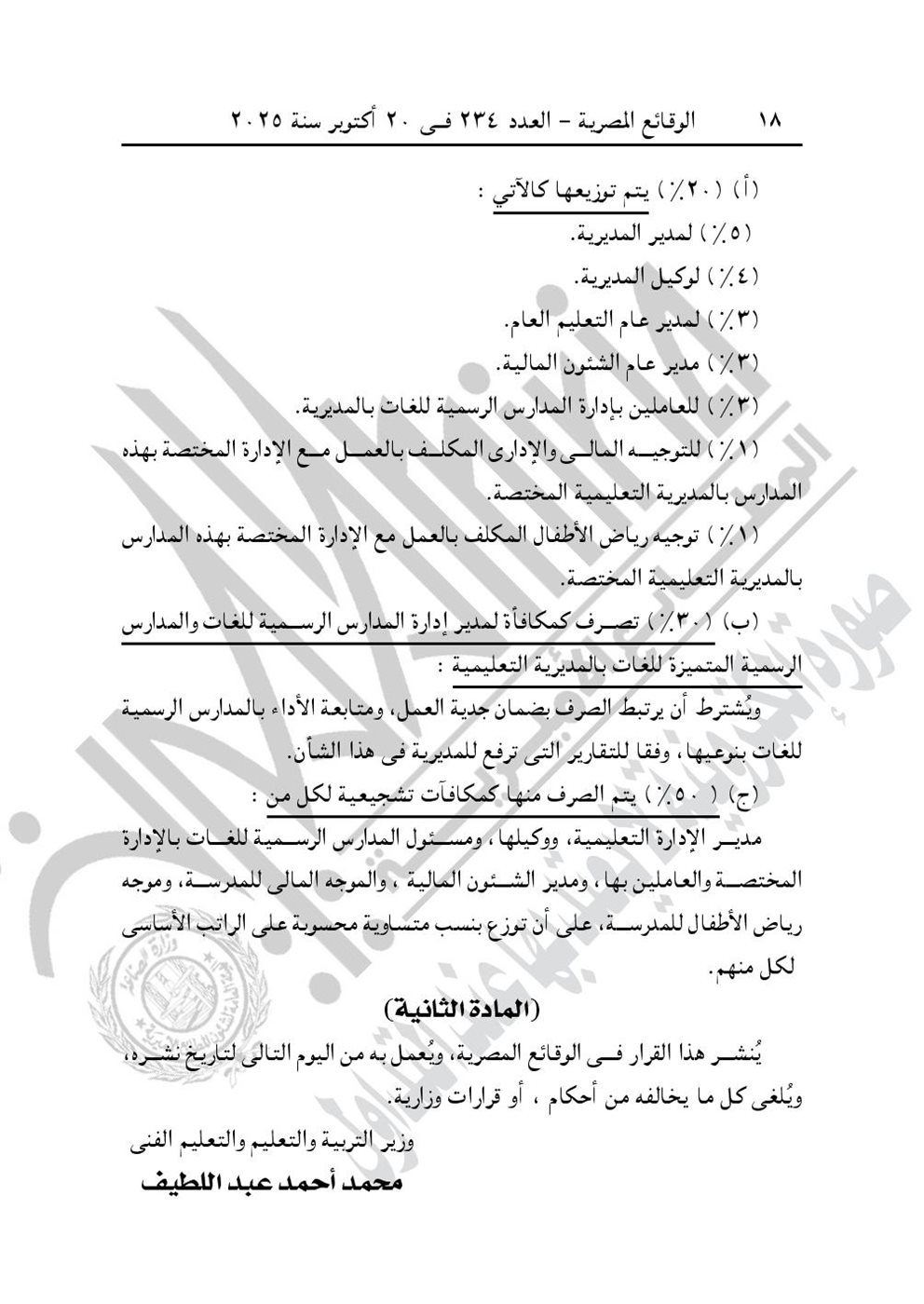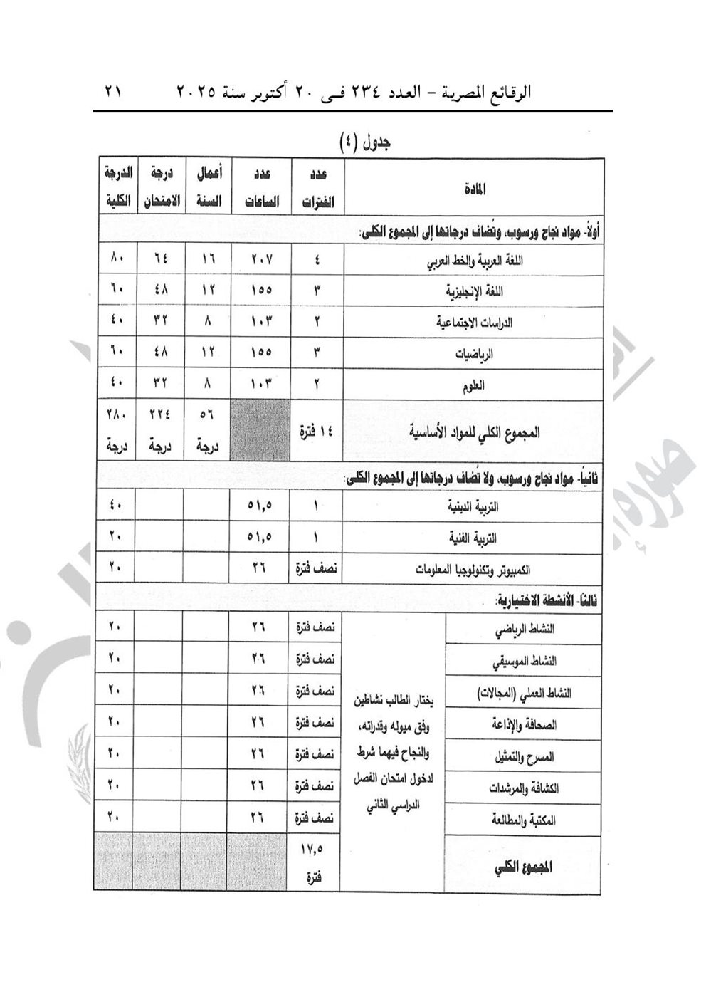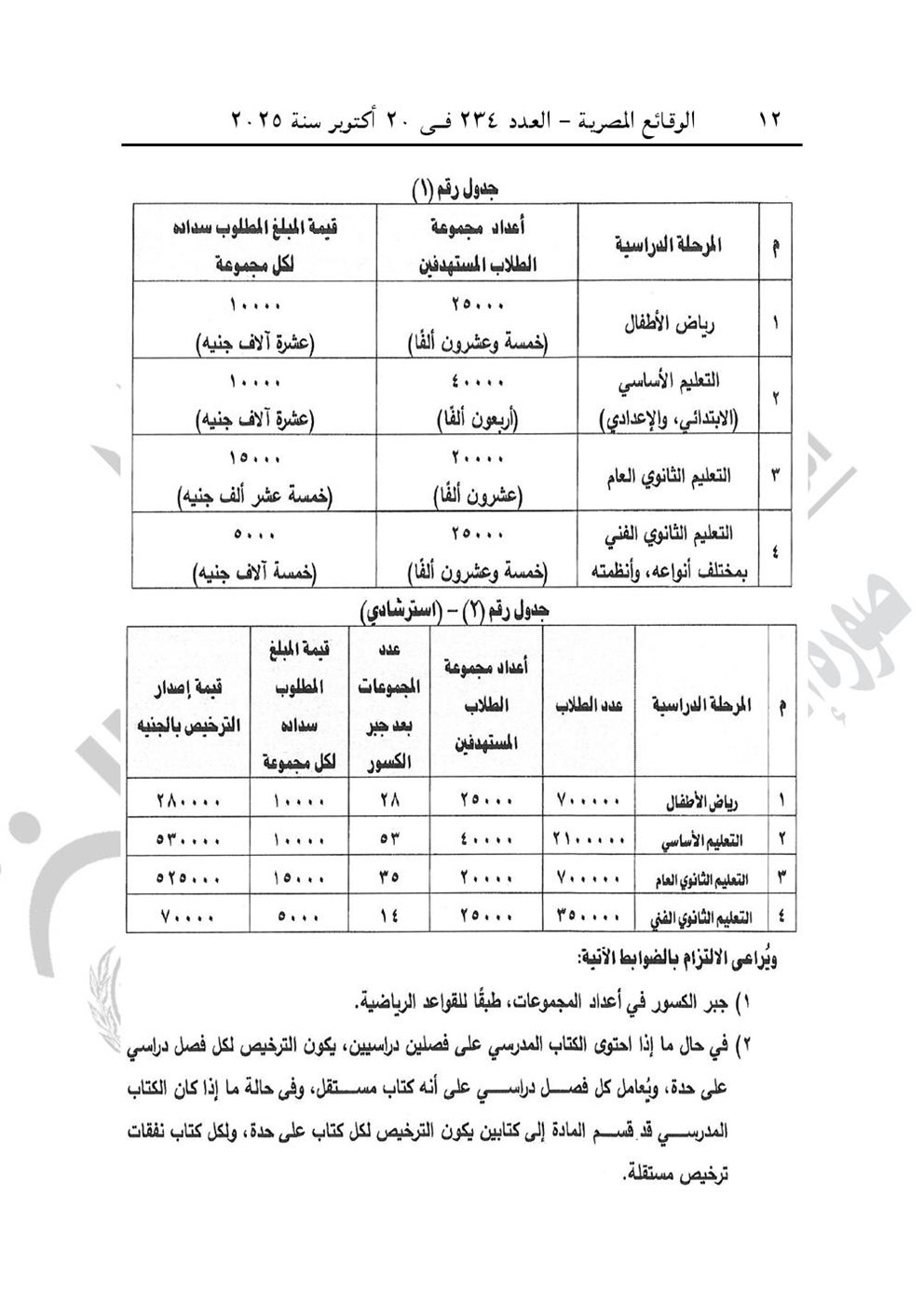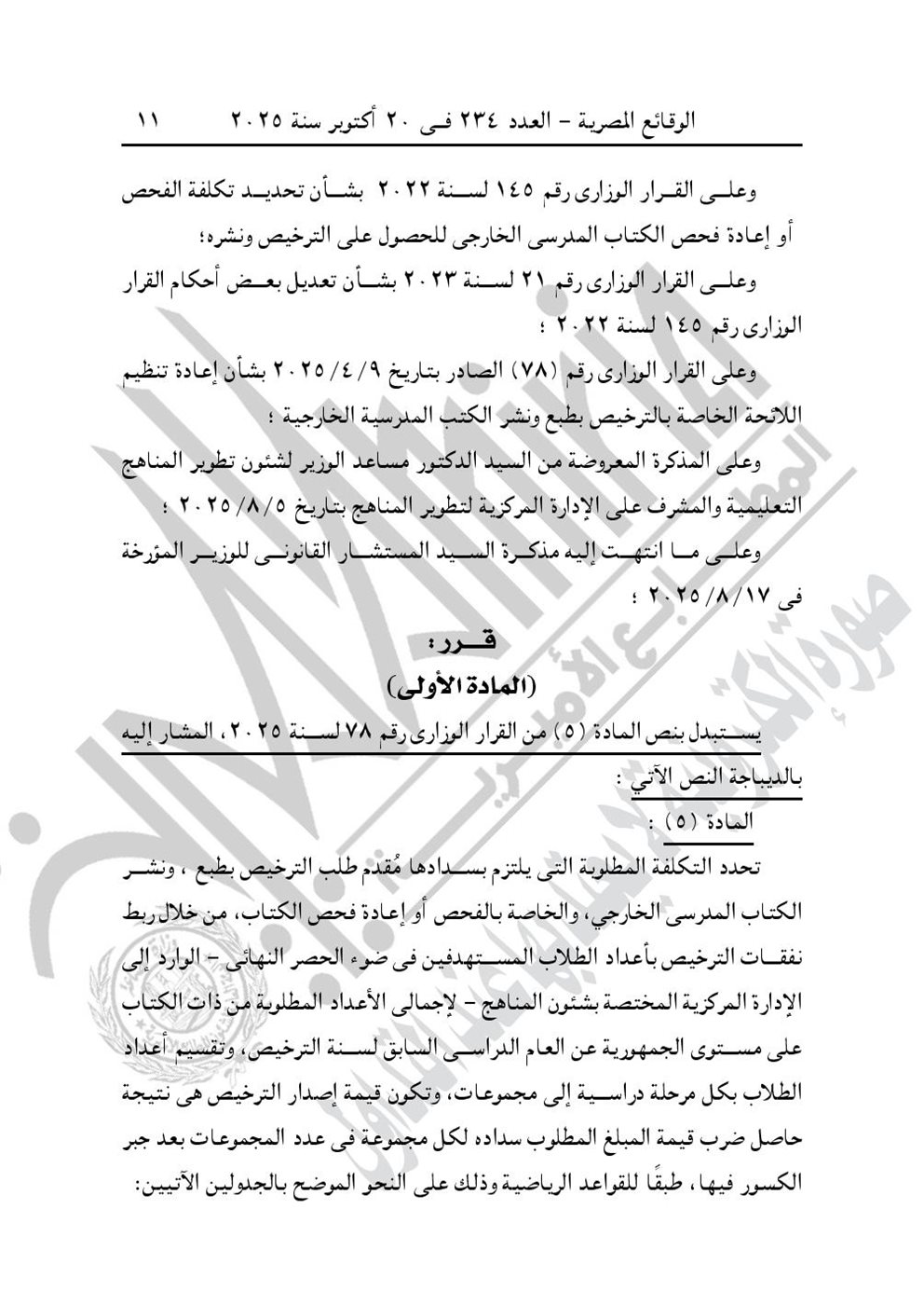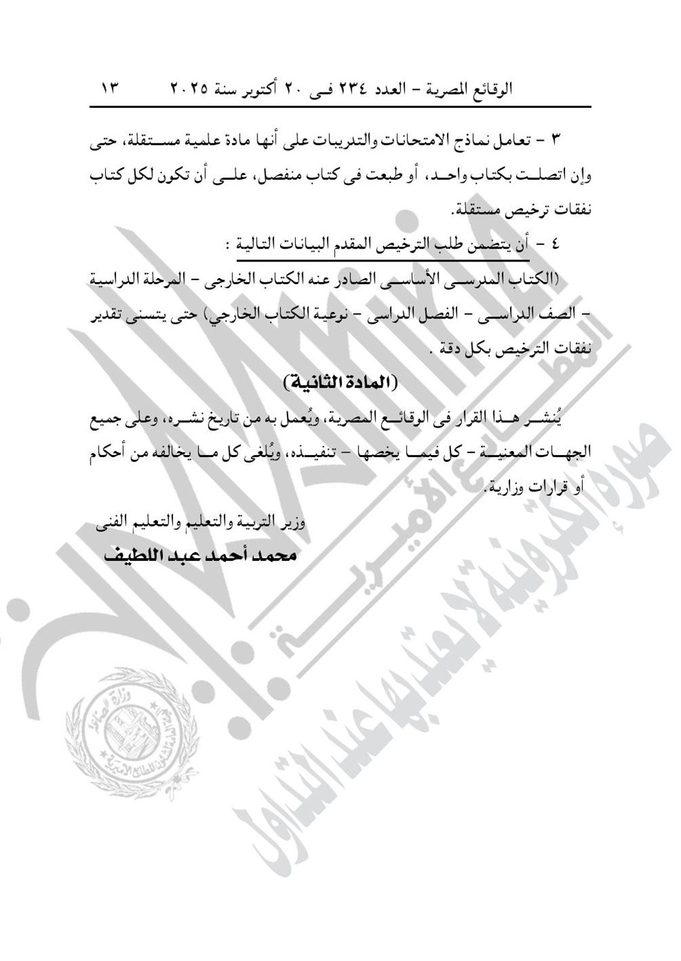 نشرت جريدة الوقائع المصرية، في عددها رقم 234، الصادر اليوم 20 أكتوبر 2025، 4 قرارات مهمة لوزارة التربية والتعليم والتعليم الفني، بشأن تحديد تكلفة الترخيص للكتب الخارجية، وتعديل بعض أحكام المدارس الرسمية للغات، والمدارس الرسمية المتميزة للغات، وإعادة تنظيم التقويم التربوى الشامل المطبق على الحلقة الإعدادية، نظام الدراسة والتقييم لمادة التربية الدينية.
