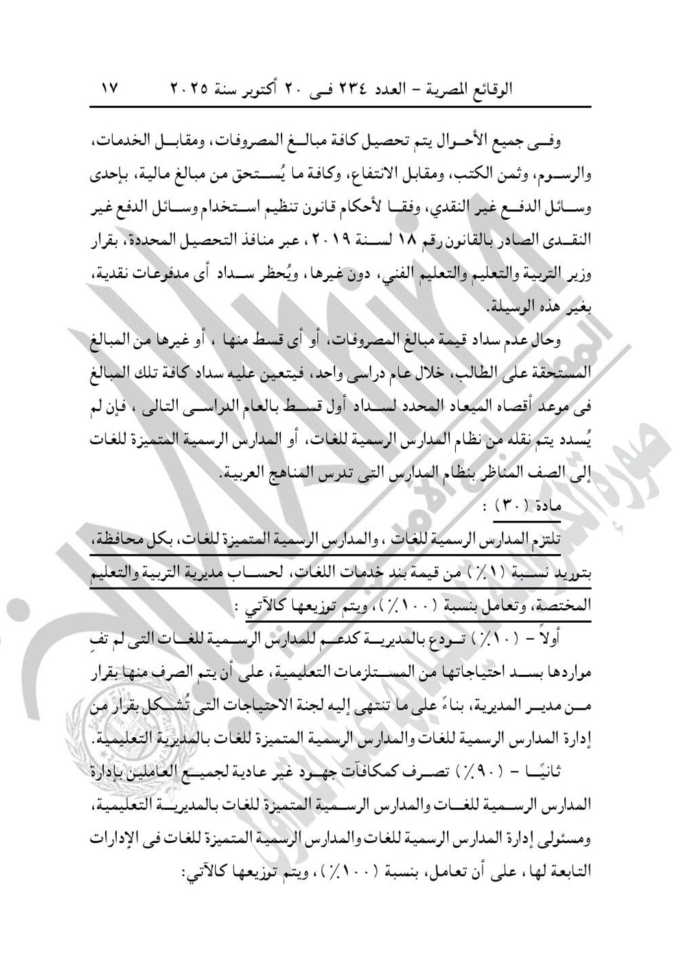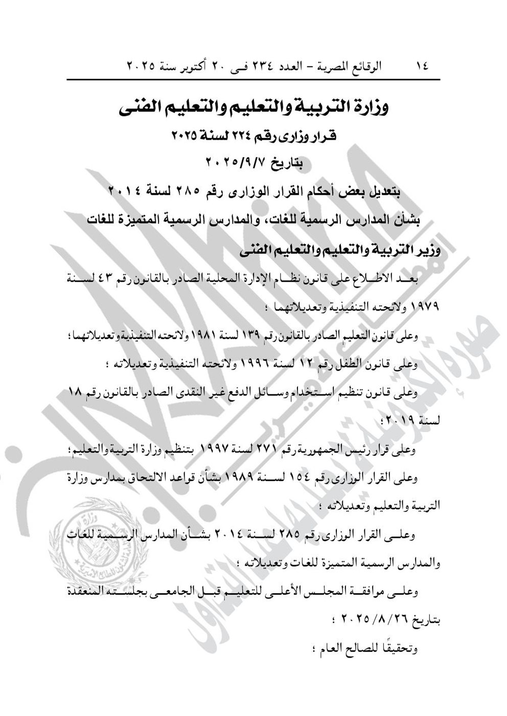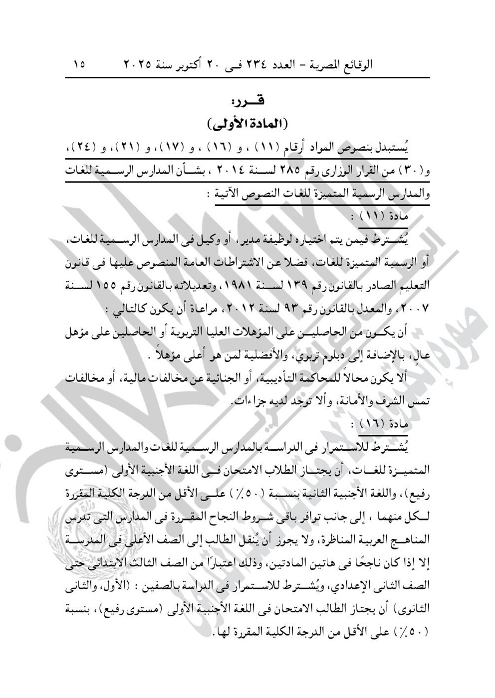 -قرار وزارة التربية والتعليم رقم 244 لسنة 2025، بتعديل بعض أحكام القرار الوزارى رقم 285 لسنة 2014، بشأن المدارس الرسمية للغات، والمدارس الرسمية المتميزة للغات.