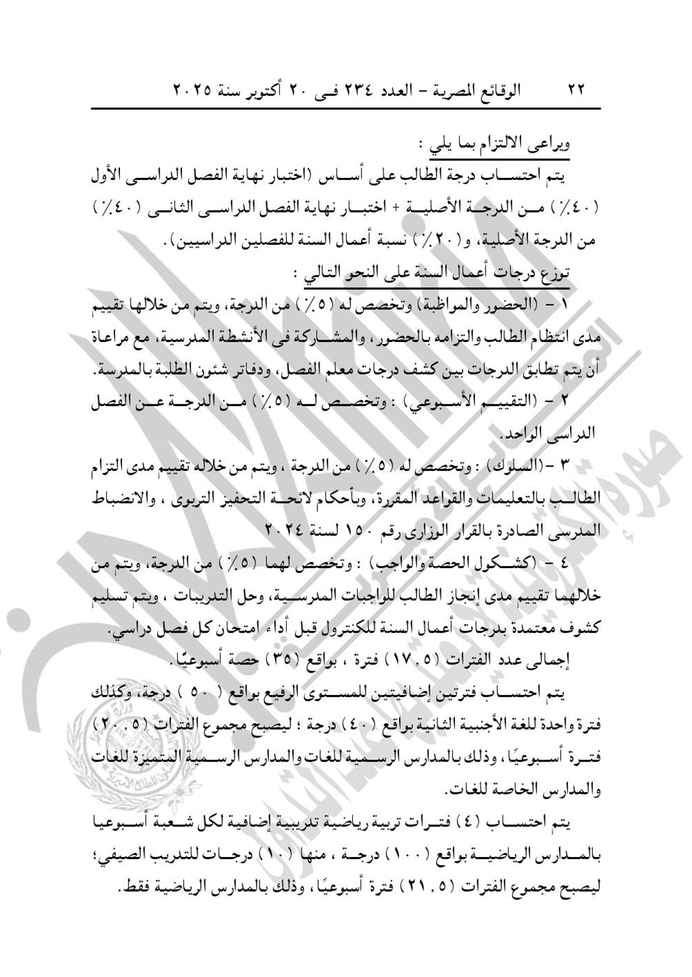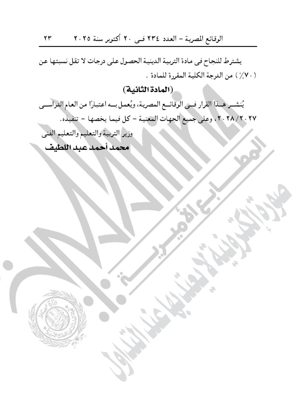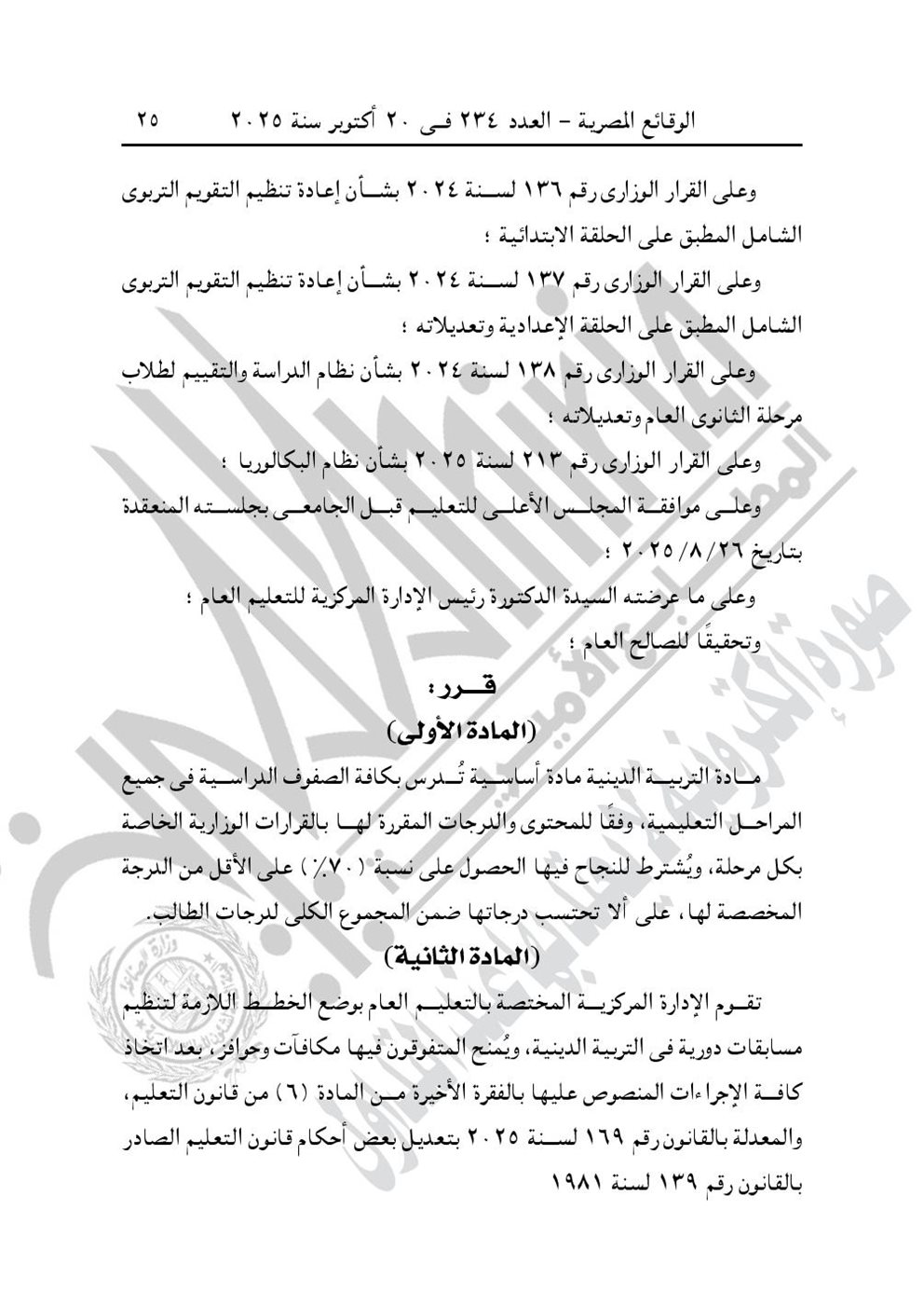 -قرار وزارة التربية والتعليم رقم 231 لسنة 2025، بشأن نظام الدراسة والتقييم لمادة التربية الدينية بجميع المراحل التعليمية.