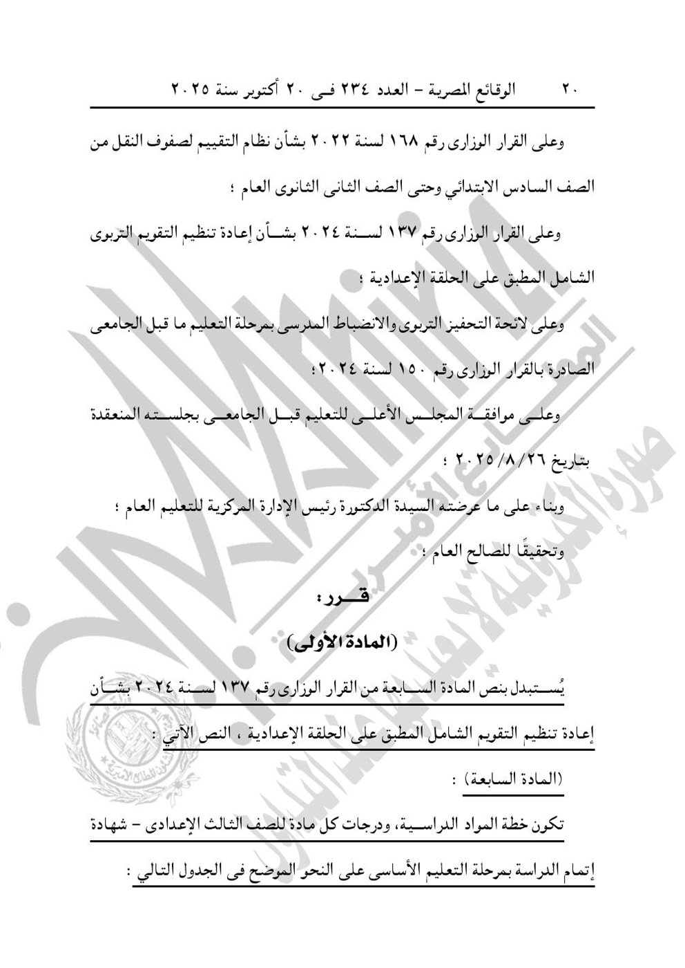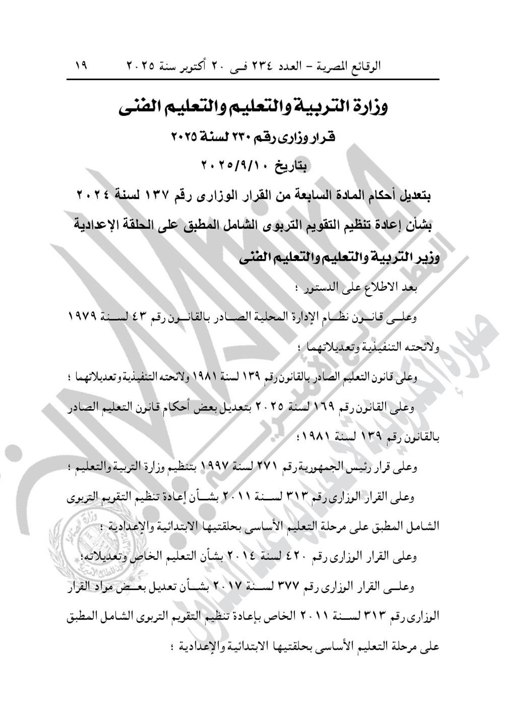 -قرار وزارة التربية والتعليم رقم 230 لسنة 2025، بتعديل أحكام المادة السابعة من القرار الوزارى رقم 137 لسنة 2024، بشأن إعادة تنظيم التقويم التربوى الشامل المطبق على الحلقة الإعدادية.