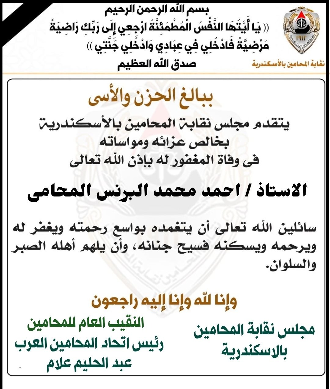 ونعت نقابة المحامين بالإسكندرية المحامي الراحل في بيان عبر صفحتها الرسمية على موقع التواصل الاجتماعي "فيسبوك" ودعت الله أن يتغمده فسيح جناته ويلهم أسرته الصبر والسلوان.