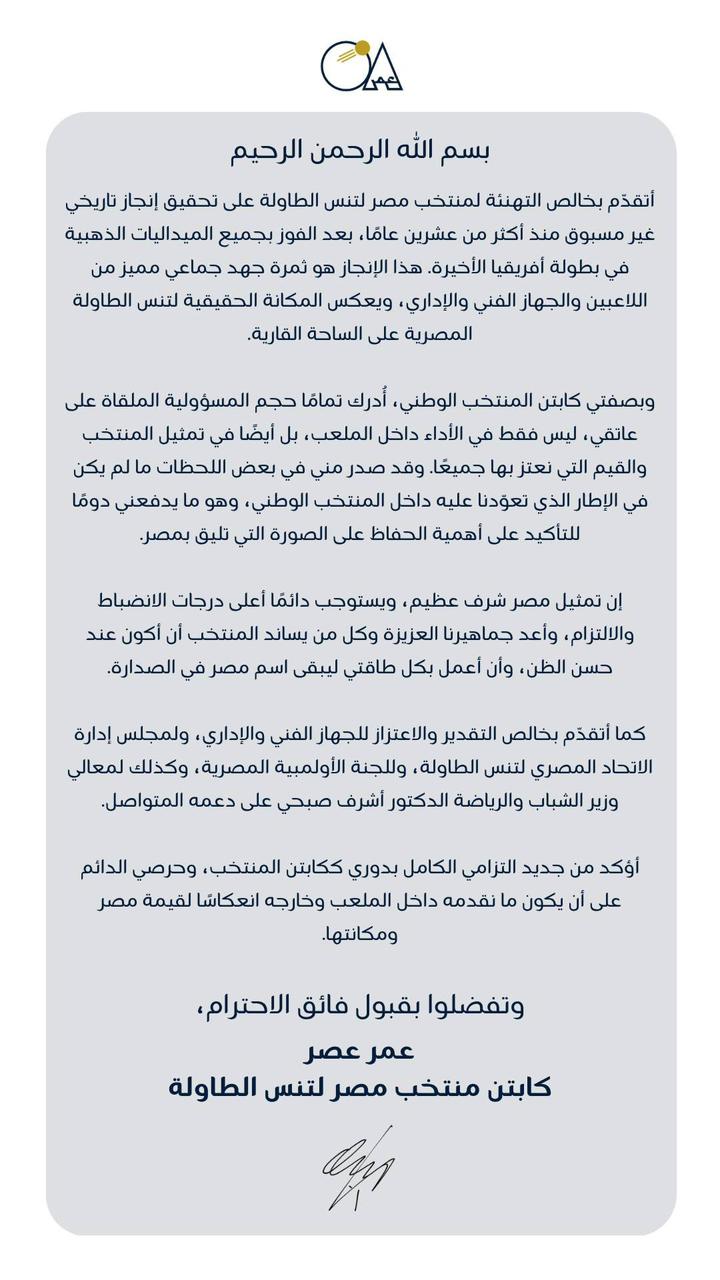 تنس الطاولة، أصدر عمر عصر لاعب المنتخب الوطني لتنس الطاولة، بيانا هاما بشأن الأزمة التي حدثت مؤخرا على هامش مشاركة المنتخب في كأس أفريقيا بتونس.