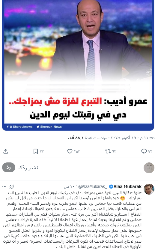 وعلق علاء مبارك، عبر منصة "أكس"، ردا على إلزام عمرو أديب المصريين للتبرع لـ إعمار غزة: "حلوةً حكاية التبرع لغزة.. مش بمزاجك، دي في رقبتك ليوم الدين! طيب ما تتبرع أنت بمزاجك.. غزة وأهلها على رؤوسنا، لكن أين الضمان أن ما حدث من قبل لن يتكرر من عمليات قامت بها حماس يرد عليها العدو بضرب غزة وتدمير البنية التحتية وهدم المبانى والمنازل وقتل المدنيين، فتطلب حماس سرعة جمع الأموال لإعادة إعمار القطاع!".