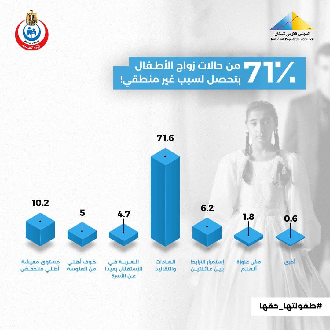 ووجه المجلس القومي للسكان رسالة مؤثرة إلى أولياء الأمور: "لو فاكر إنك بتستر بنتك بزواج الأطفال، فكر تاني... لأنك ممكن تكون بتكسر ظهرها، الستر الحقيقي إنك تديها فرصة تكبر وتتعلم وتعيش."
