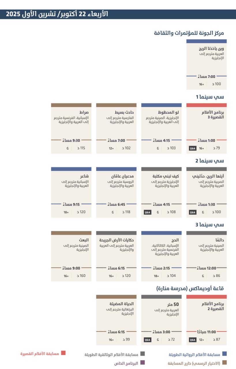 - 5:30 مساء.. حلقة نقاشية "فن الحكي في عالم الشركات: عندما تلتقي الإستراتيجية التجارية بالرؤية السينمائية" المتحدثون: هشام مهران، كريم خضر، المهندس محمد أبو غالي، يدير الحوار: أحمد طارق.. مسرح الجزيرة.