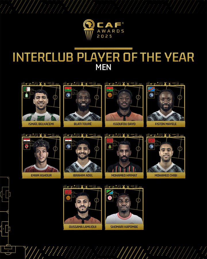 جوائز الاتحاد الأفريقي، تواجد إمام عاشور لاعب الأهلي ورباعي بيراميدز فيستون ماييلي وبلاتي نوريه ومحمد الشيبي وإبراهيم عادل المنتقل للجزيرة الإماراتي ضمن المرشحين لجائزة أفضل لاعب داخل أفريقيا لعام 2025.