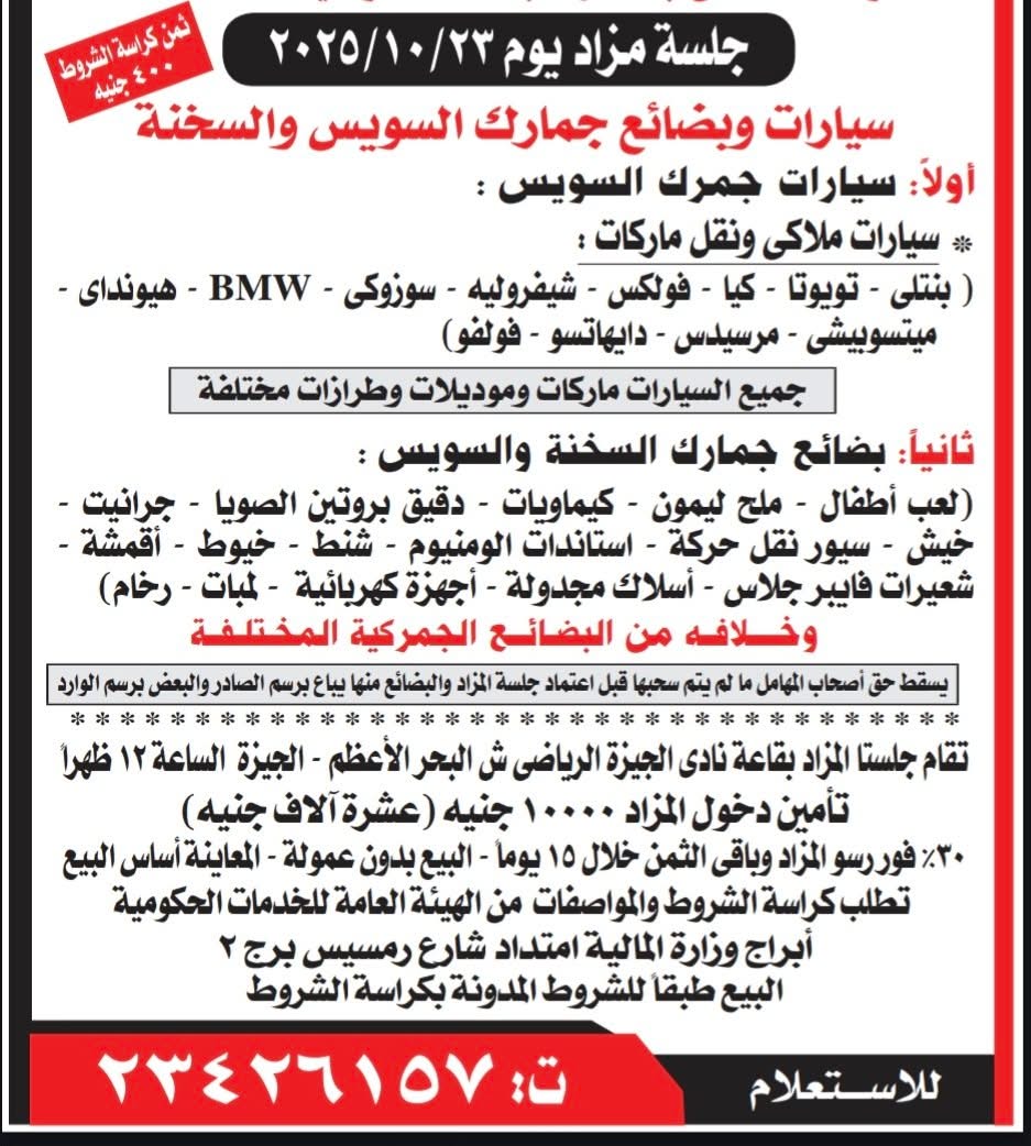 تقيم الهيئة العامة للخدمات الحكومية التابعة لوزارة المالية يوم الخميس الموافق 23 أكتوبر 2025 جلسة مزاد علني لبيع مجموعة من السيارات والبضائع المصادرة بجمارك السويس والسخنة، وذلك بقاعة نادي الجزيرة الرياضي بشارع البحر الأعظم في الجيزة، في تمام الساعة الثانية عشرة ظهرًا.